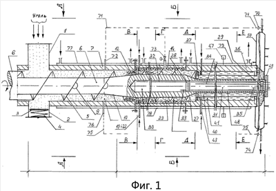 При необходимости поддержки устройства в рабочем состоянии без доступа исходного материала (угля) из нижней крышки 51 фракционатора 50 через отверстие 52 с разделительным клапаном 74 в коллектор 75 поступает жидкофазный материал, который нагнетается через отверстие 76 зоны сжатия райзера 7 и циркулирует по кругу устройства при температуре, регулируемой водяной рубашкой 77.