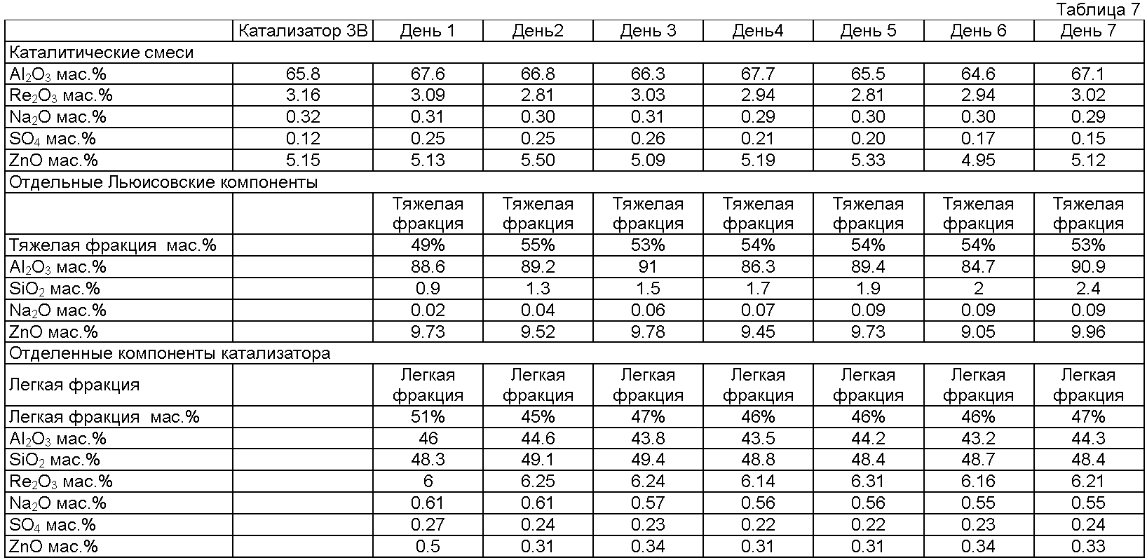 В ходе испытания ежедневно проводили отбор небольшого количества образца катализатора. Для каждого образца катализатора кислотный Льюисовский компонент 2А и компонент 5А цеолитсодержащего катализатора подвергали разделению методом разделения в тяжелой среде. Химические свойства каталитических смесей и раздельных образцов Льюисовского кислотного компонента и цеолитных компонентов представлены ниже в таблице 13. Из представленных данных следует, что к 5-му дню испытания около 0,01% Na2O и около 0,4% SiO2 перемещались в льюисовский кислотный компонент из катализатора крекинга. В сравнении с данными приведенного выше примера 3 оказалось, что к 5-му дню испытания около 0,07% Na2O и порядка 1,4% оксида кремния переходили в добавку, содержащую кислоту Льюиса. Полученные результаты вновь показывают, что перемещение небольшого количества Na2O и SiO2 из катализатора 5А способствует сохранению активности присадки, содержащей кислоту Льиюса в уменьшении содержания серы.