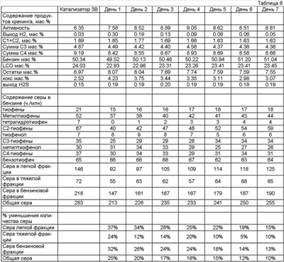 Из представленных данных следует, что уменьшение содержание серы в бензиновой фракции составляет 54% в первый день испытания и 51% на 5-й день испытания. Примерно 94% активность в уменьшении содержания серы в бензиновой фракции сохраняется в течение дней испытания. В сравнении с результатами примера 3 лишь 56% понижение содержания серы достигается через 5 дней испытания. Полученный результат показывает, что относительное улучшение активности в уменьшении содержания серы достигает ~40%.