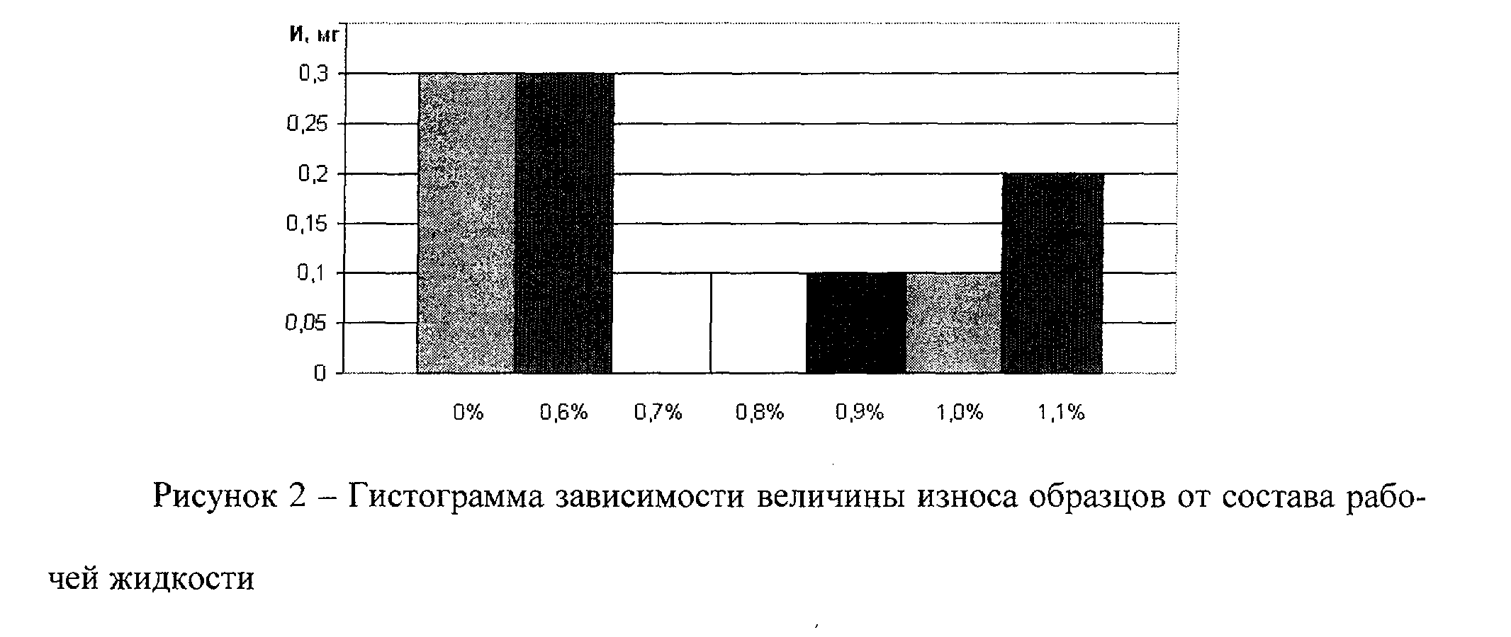 1,0%. Меньшее содержание присадки не обеспечивает необходимых противоизносных свойств. Содержание присадки более 1,0% улучшает указанные свойства незначительно при значительном удорожании разрабатываемой рабочей жидкости.