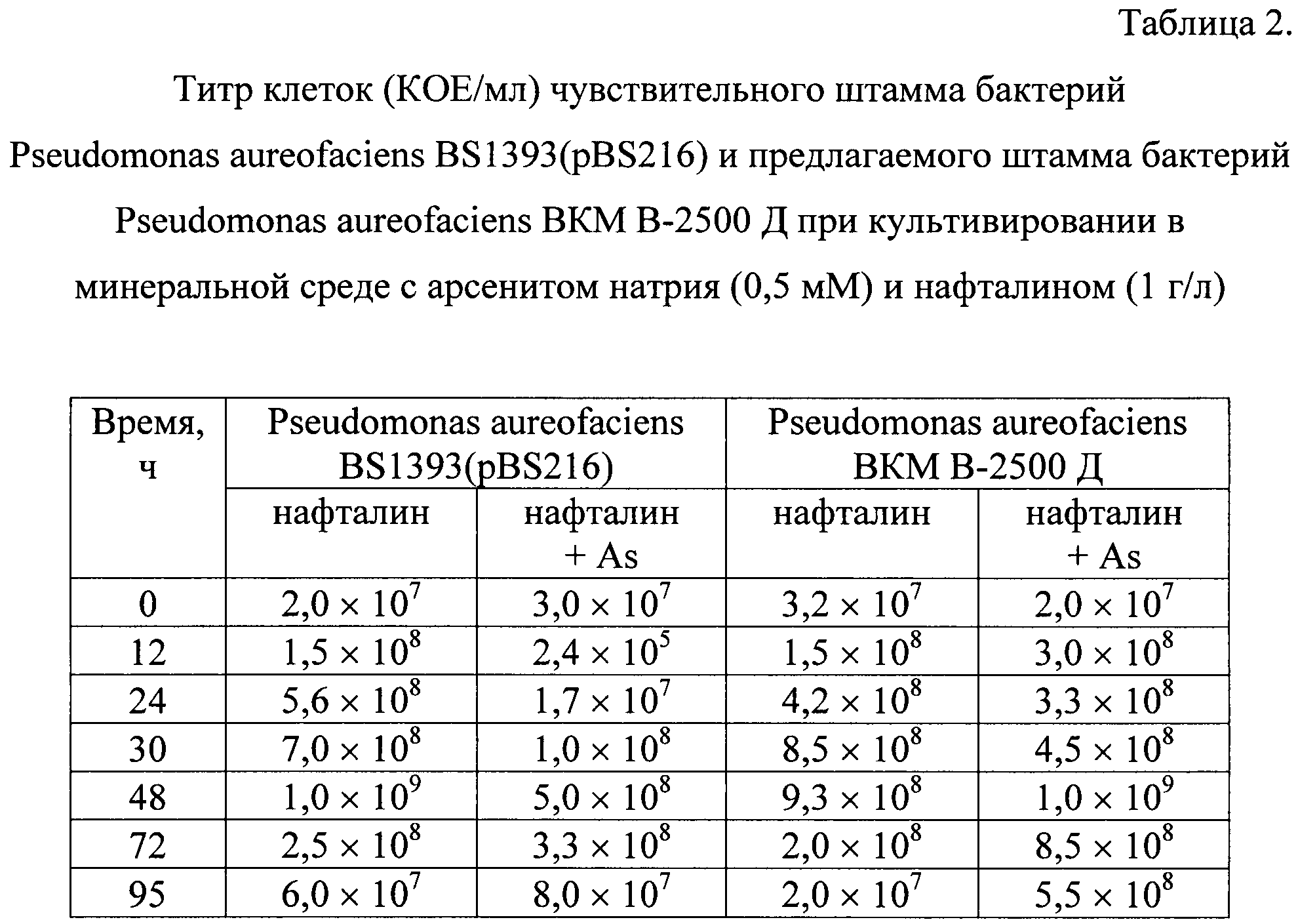 Подсчет количества жизнеспособных клеток предлагаемого штамма Pseudomonas aureofaciens ВКМ В-2500 Д в культуральной среде показывает, что через 48 ч культивирования КОЕ возрастает на 2 порядка по сравнению с титром клеток при заражении независимо от условий культивирования (наличие или отсутствие мышьяка в среде) и достигает около 1,0×109 КОЕ/мл.