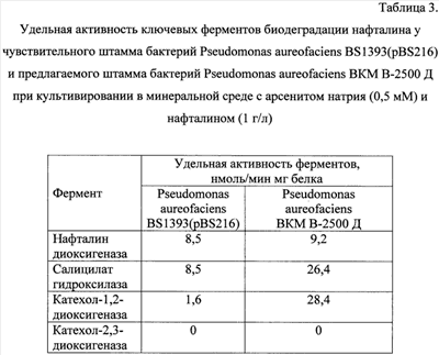 Арсенит натрия не оказывает ингибирующего влияния на активность ключевых ферментов биодеградации нафталина у предлагаемого штамма Pseudomonas aureofaciens ВКМ В-2500 Д. В присутствии арсенита натрия уровни активности нафталин диоксигеназы у чувствительного Pseudomonas aureofaciens BS1393(pBS216) и предлагаемого Pseudomonas aureofaciens ВКМ В-2500 Д штаммов не отличаются. Активность салицилат гидроксилазы и катехол-1,2-диоксигеназы у предлагаемого штамма в 3 и 18 раз соответственно выше чем у чувствительного. Активность катехол-2,3-диоксигеназы в обоих штаммах в присутствии мышьяка не регистрируется.