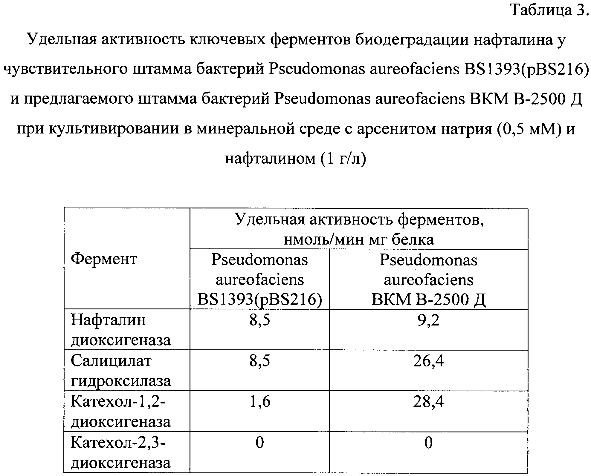 Пример 3. Удельная активность ключевых ферментов биодеградации нафталина у чувствительного штамма бактерий Pseudomonas aureofaciens BS1393(pBS216) и предлагаемого штамма бактерий Pseudomonas aureofaciens ВКМ В-2500 Д в присутствии арсенита натрия.