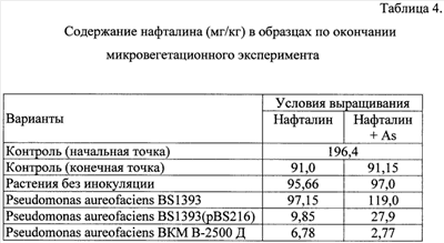 Полученные значения, представленные в Таблице 4, показывают, что инокуляция растений предлагаемым штаммом Pseudomonas aureofaciens ВКМ В-2500 Д способствует практически полной деградации нафталина в присутствии арсенита натрия. Остаточное содержание нафталина в этом варианте составляет 2,77 мг/кг по сравнению с контролем (91,15 мг/кг нафталина в конце эксперимента).