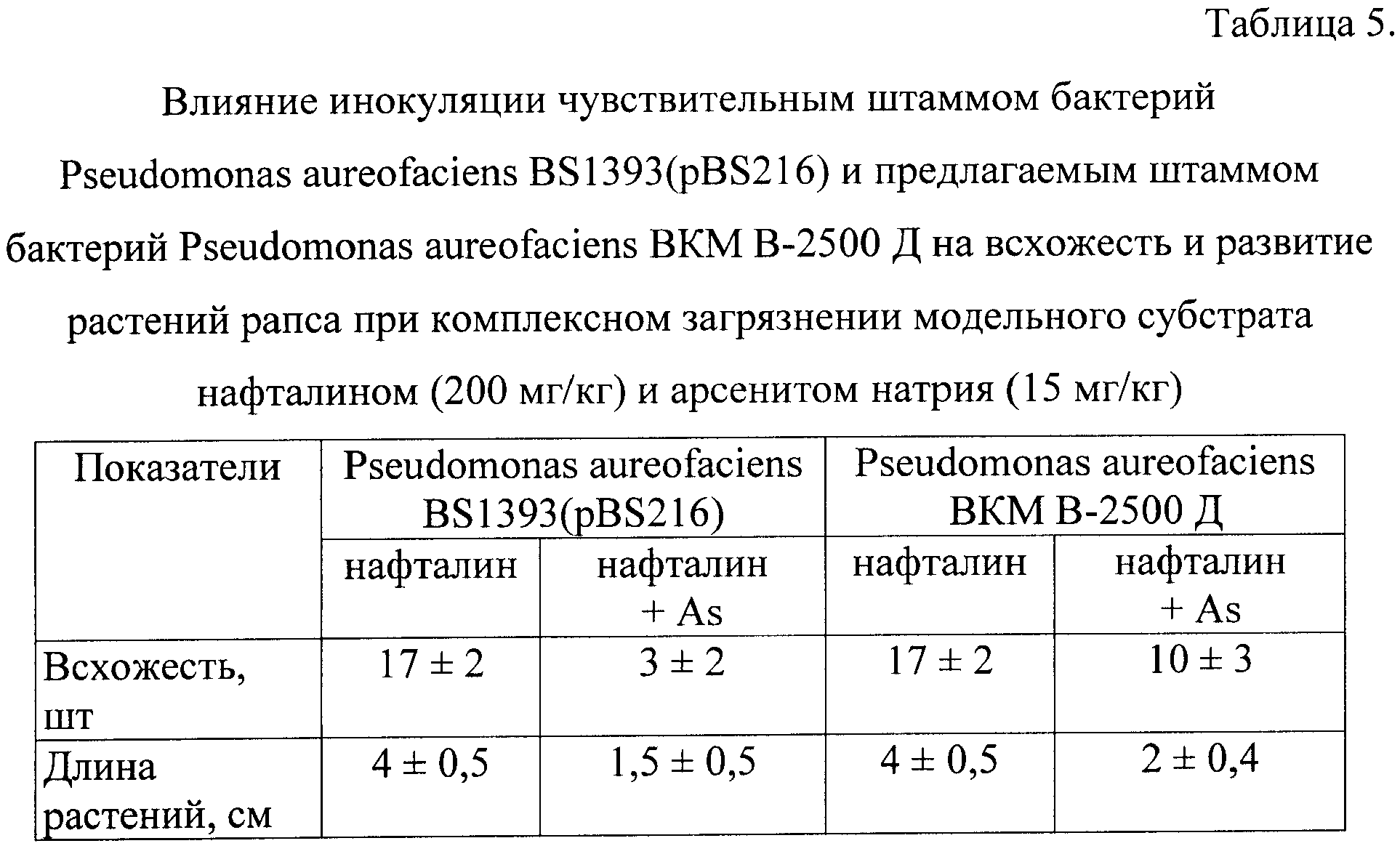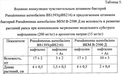 Т.е. инокуляция проростков рапса предлагаемым штаммом Pseudomonas aureofaciens ВКМ В-2500 Д способствует повышению всхожести растений и увеличению их биомассы в стерильном микровегетационном эксперименте при комплексном загрязнении субстрата нафталином и арсенитом натрия (Таблица 5).