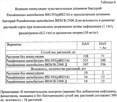 Рост растений значительно ингибируется в присутствии ПАУ и мышьяка. Инокуляция семян/проростков растений предлагаемым штаммом бактерий Pseudomonas aureofaciens ВКМ В-2500 Д способствует повышению всхожести растений и увеличению их биомассы как в условиях стерильного микровегетационного эксперимента (Таблица 5), так и при выращивании растений в комплексно загрязненной почве (Таблица 6, 7).