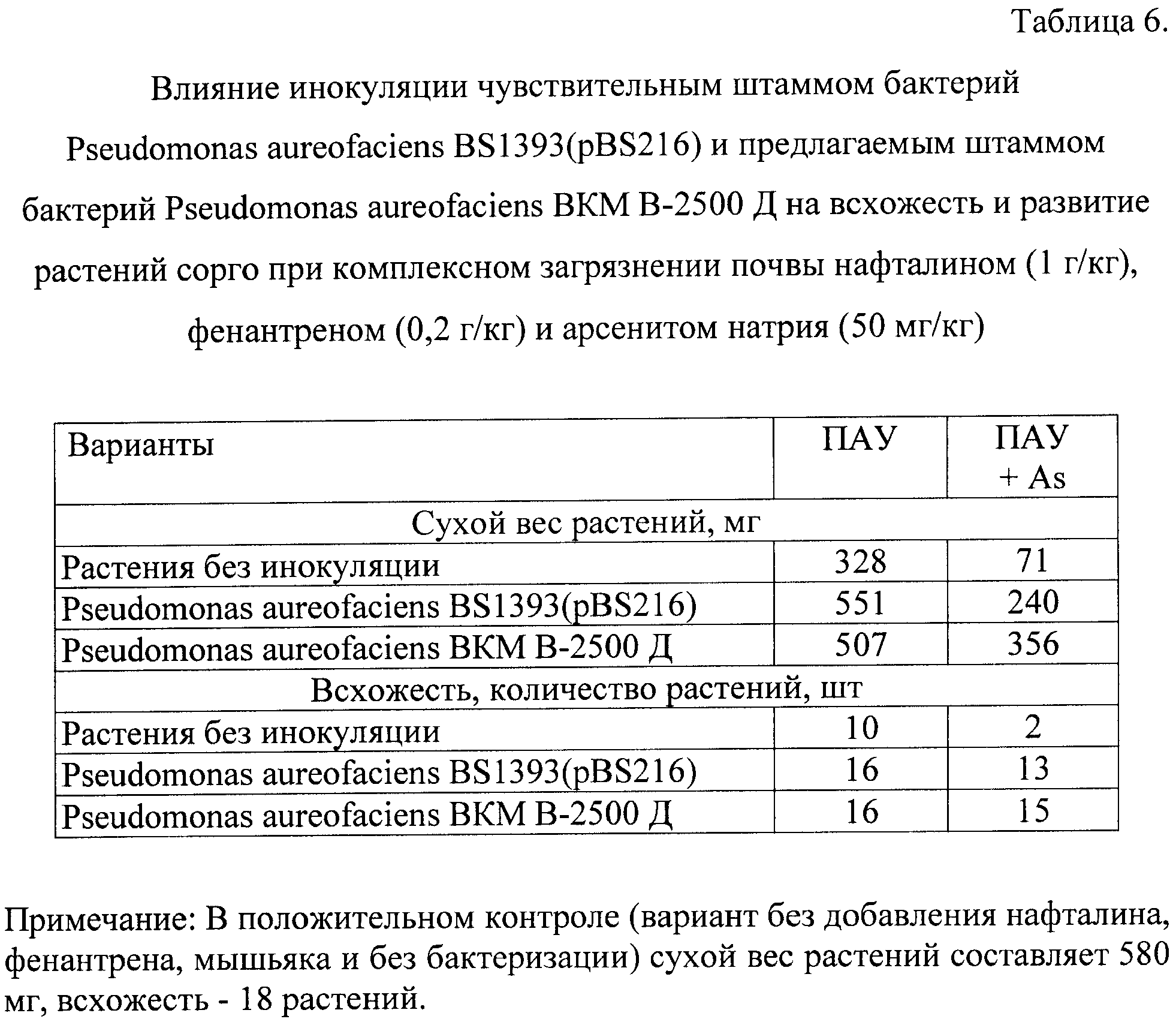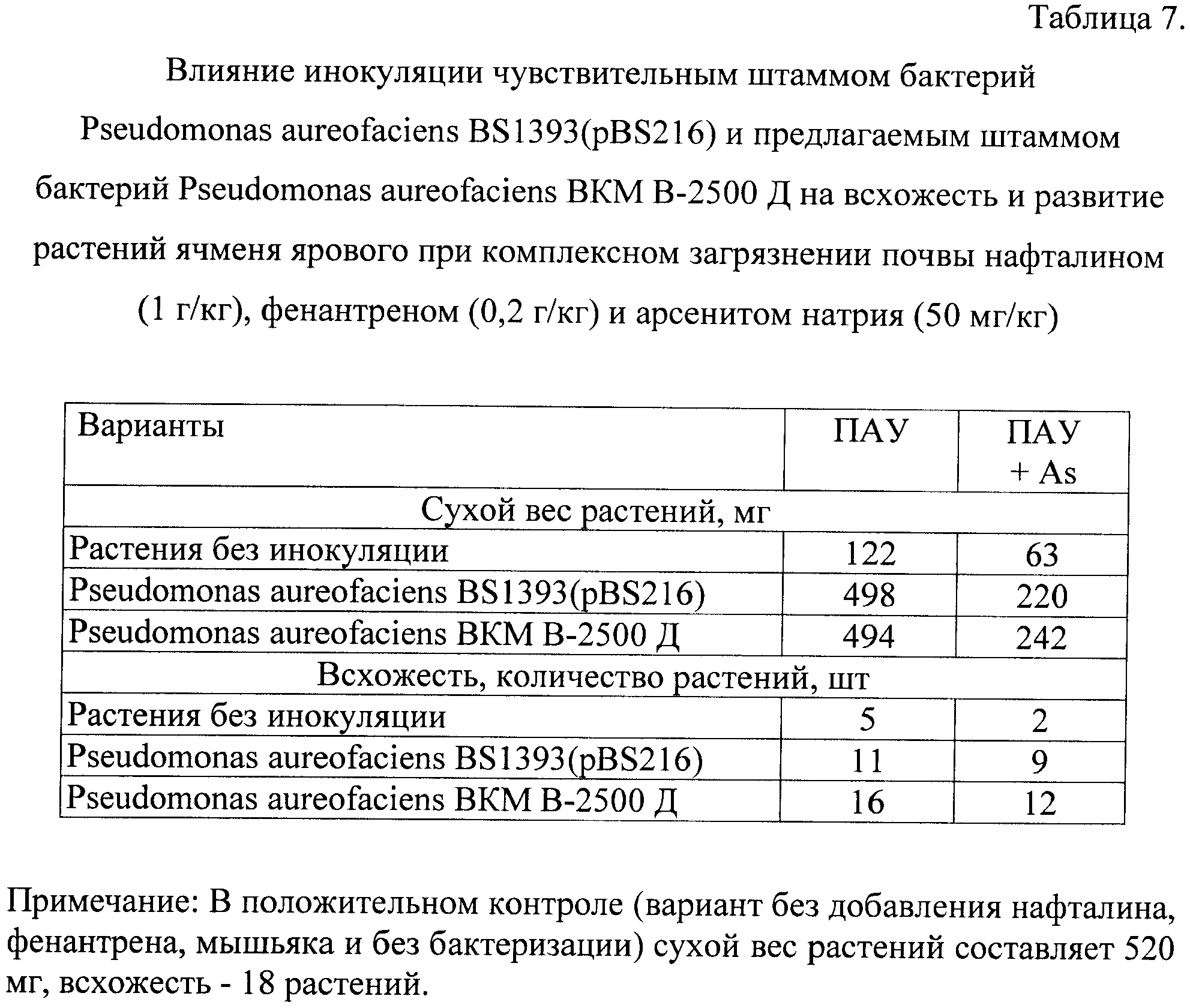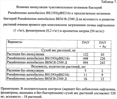 Данные, представленные в Таблице 7, показывают, что инокуляция семян ячменя ярового предлагаемым штаммом Pseudomonas aureofaciens BKM В-2500 Д способствует повышению всхожести растений и увеличению их биомассы при комплексном загрязнении почвы нафталином (1 г/кг), фенантреном (0,2 г/кг) и арсенитом натрия (50 мг/кг).