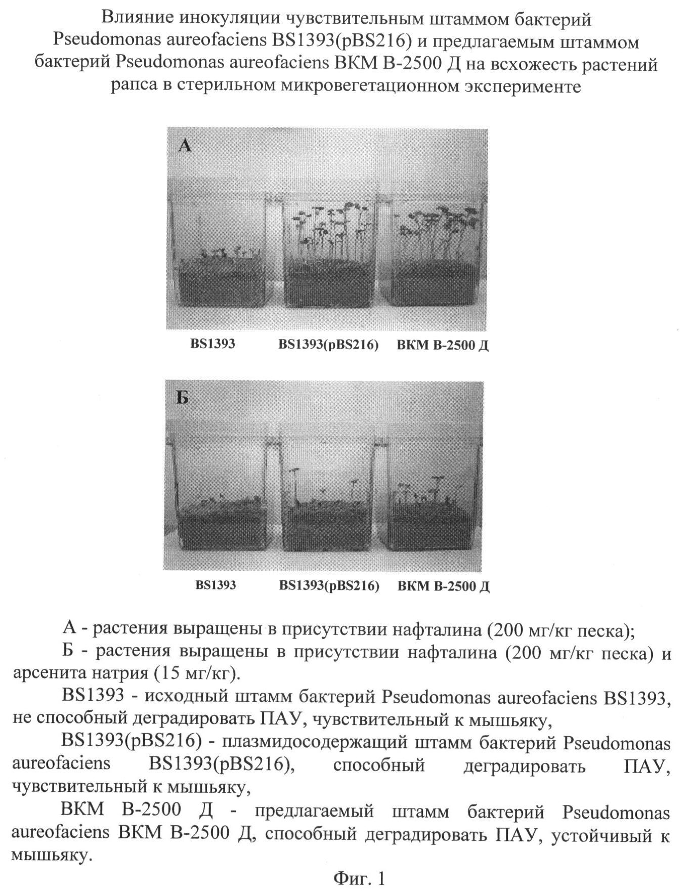 Штамм бактерий Pseudomonas aureofaciens BKM В-2500 Д содержит природную плазмиду биодеградации нафталина pBS216 (Кочетков В.В., Балакшина В.В., Мордухова Е.А., Боронин A.M. Плазмиды, кодирующие биодеградацию нафталина в ризосферных бактериях рода Pseudomonas. Микробиология. 1997. Т.66. 2, с.211-216) и генетически сконструированную плазмиду устойчивости к мышьяку pKS1, ранее обозначенную как pUCP22::arsRBC (Сизова О.И., Любунь Е.В., Кочетков В.В., Валидов Ш.З., Воронин A.M. Влияние природных и генетически модифицированных ризосферных бактерий Pseudomonas aureofaciens на накопление мышьяка растениями. Прикладная биохимия и микробиология. 2004. Т.40. 1, c.78-82).