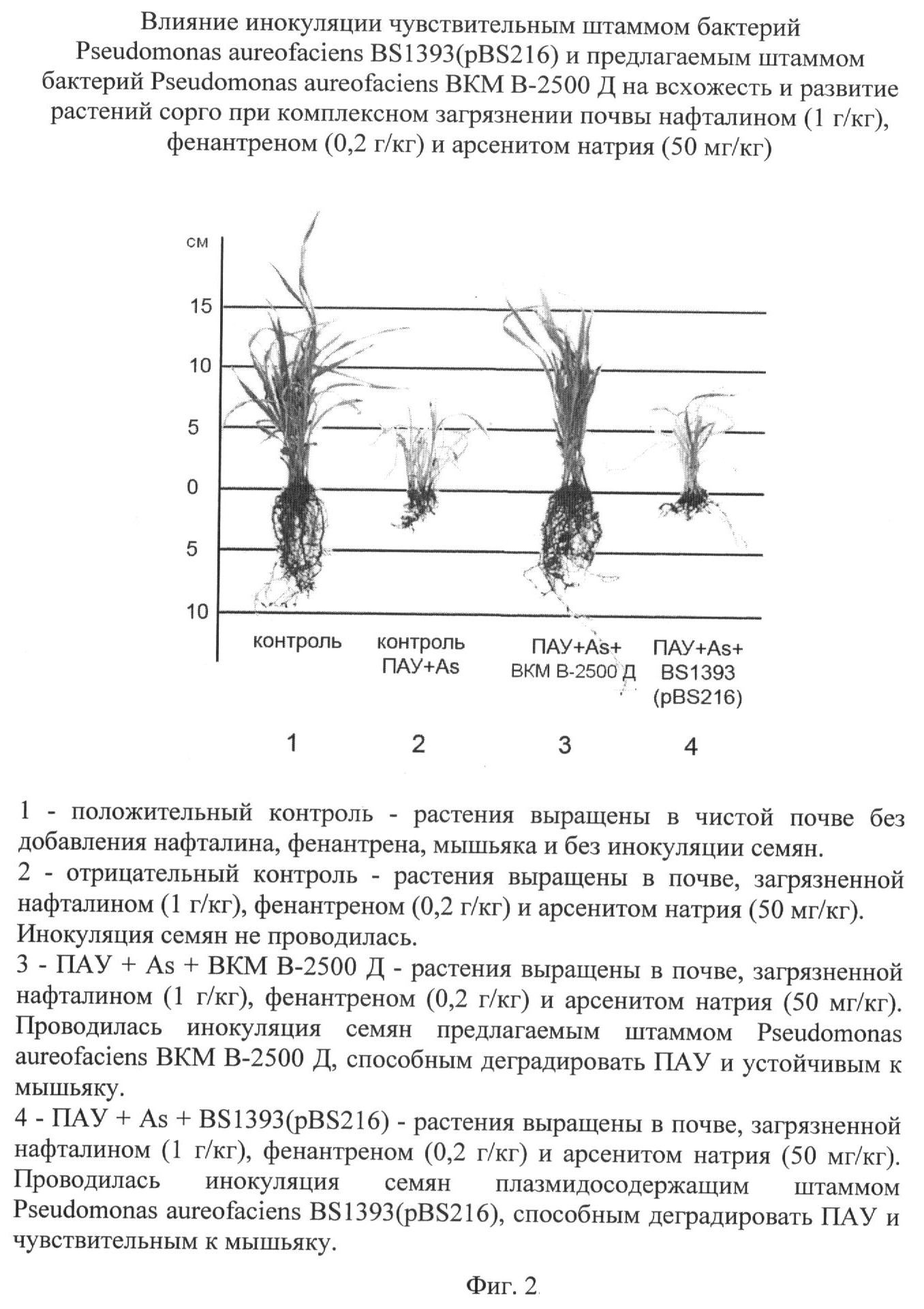 Нафталин (200 мг/кг) значительно ингибирует рост растений в стерильном микровегетационном эксперименте. Чувствительный штамм бактерий Pseudomonas aureofaciens BS1393(pBS216) и предлагаемый штамм бактерий Pseudomonas aureofaciens ВКМ В-2500 Д, несущие плазмиду биодеградации нафталина pBS216, защищают растения от его негативного воздействия. В присутствии арсенита натрия этот эффект в большей степени сохраняется у предлагаемого штамма Pseudomonas aureofaciens ВКМ В-2500 Д, содержащего плазмиду биодеградации нафталина pBS216 и плазмиду устойчивости к мышьяку pKS1 (Фиг.1).
