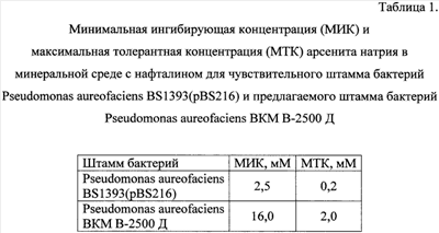 Представленные в Таблице 1 результаты показывают, что МИК и МТК мышьяка в минеральной среде для чувствительного штамма Pseudomonas aureofaciens BS1393(pBS216) составляют 2,5 и 0,2 мМ, а для предлагаемого штамма Pseudomonas aureofaciens ВКМ В-2500 Д – 16,0 и 2,0 мМ соответственно.