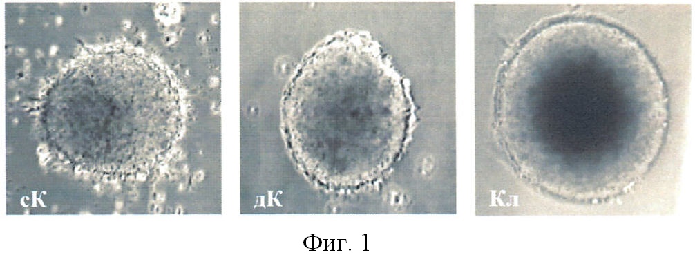 Клиностатирование ЭТ в течение 72 ч in vitro показал наличие разной морфологии ЭТ в трех образцах (сК-статический контроль, дК-динамический контроль и клиностат) (фиг.1). В частности, показано, что клиностатируемые ЭТ за счет постоянного вращения поддерживаются в суспензионном состоянии, и что особенно важно, так это то, как на момент окончания воздействия визуально было обнаружено, что клиностатируемые ЭТ отличались более ровной и округлой формой (фиг.1).