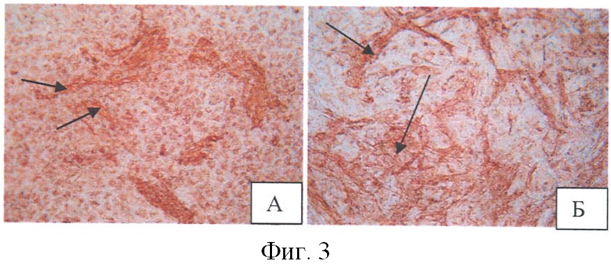 На фиг.3 показано иммуноцитохимическое окрашивание дифференцированных ЭСК антителами к тропонину I через 18 суток после клиностатирования: А – опыт (×200); Б – контроль (×200). Стрелкой указаны окрашенные клетки.