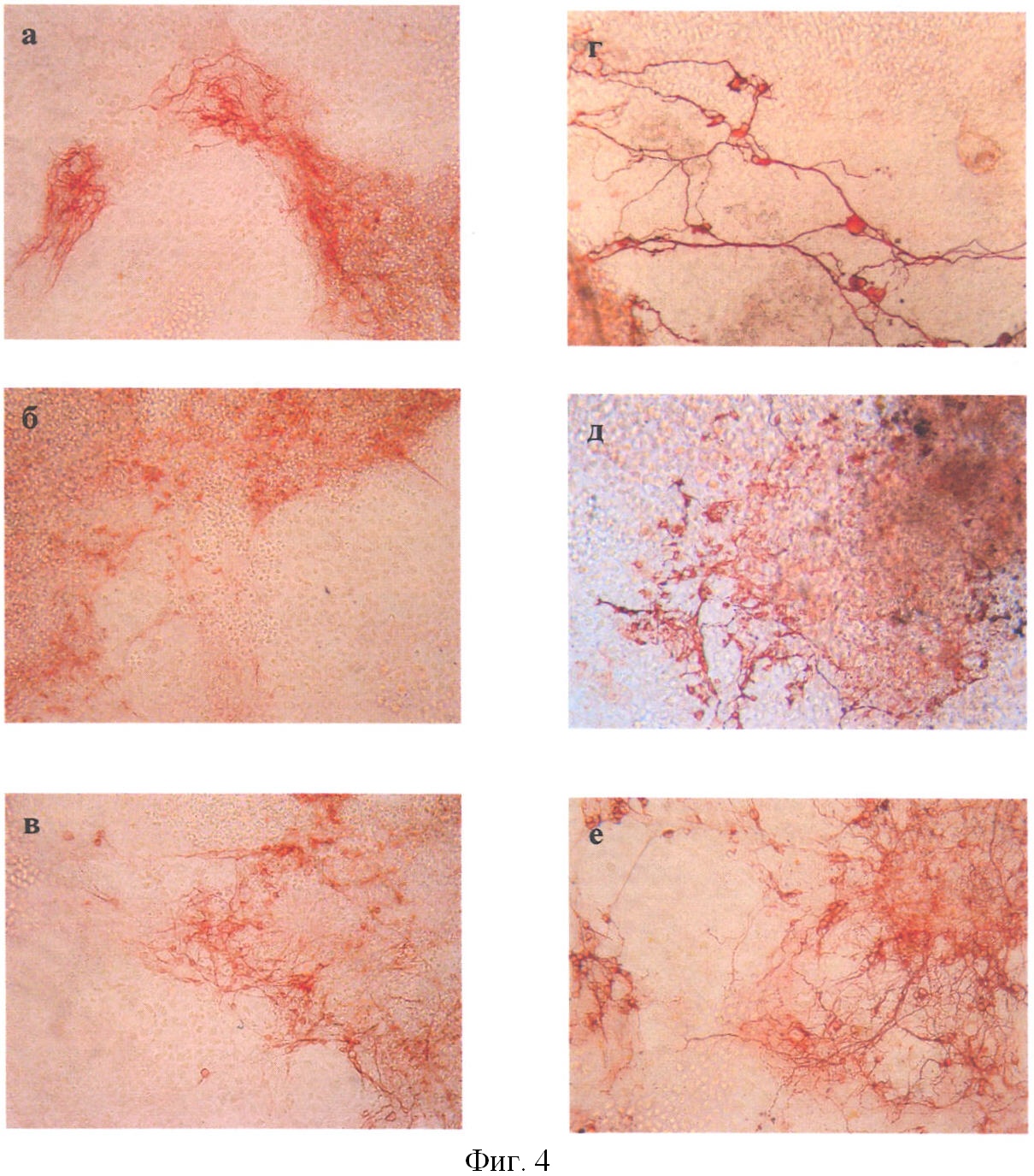 На фиг.4 показана окраска дифференцированных клеток из ЭТ на специфические маркеры (×200): МАР2: а – сК; б – опыт; в – дК; -III тубулин: г – сК; д – опыт; е – дК.