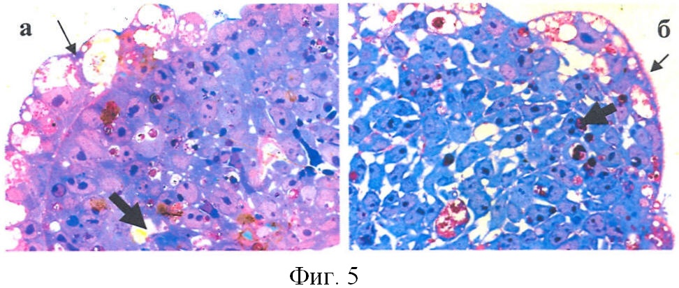 На рисунке 5 показаны полутонкие срезы ЭТ (толщина 1-2 мкм). Окраска метиленовым синим-азуром-фуксином: а – контроль; б – опыт (увелич.×400). Толстые стрелки – пустоты и ядра апоптотических клеток. Тонкие стрелки – клетки внешнего слоя.