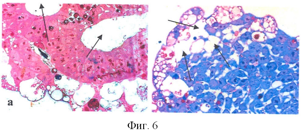 При эмбриональном развитии млекопитающих ранним сигналом процессов апоптоза является кавитация, т.е. когда часть клеток эмбриональной эктодермы, уходя в апоптоз, формирует впадину за счет активации процессов аутофагии [Coucouvanis and Martin, 1995; Qu X. et al, 2007]. В экспериментах по изобретению, как можно видеть из фиг.6, в ЭТ контроле в центральной части располагались достаточно большие по размеру пустоты (показано стрелками) по сравнению с ЭТ опытом. Причем вокруг них можно было обнаружить клетки, по морфологическим признакам напоминающие эпителий.