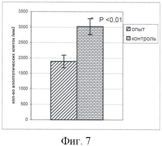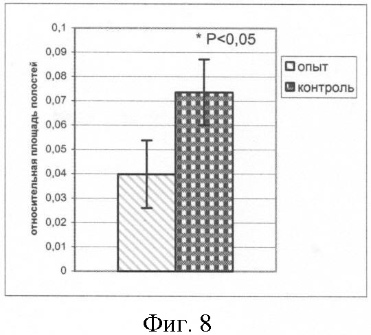 Обнаружено (фиг.7) существенно меньшее количество апоптотических клеток, приходящихся на 1 мм площади среза ЭТ в опыте по сравнению с контролем (p<0,01; критерий Манна-Уитни; ni=24 (опыт), п2=67 (контроль)). При этом относительная площадь полостей в опыте достоверно ниже таковой в контроле (p<0,05; критерий Манна-Уитни; п1=24, п2=70) (фиг.8).