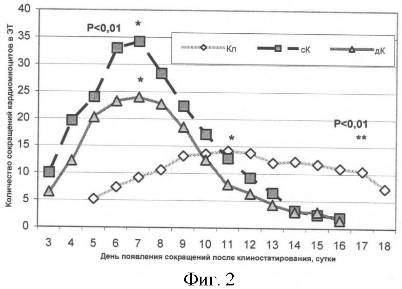 На фиг.2 показана динамика появления сокращающихся кластеров кардиомиоцитов в ЭТ после остановки клиностатирования: Кл – опыт, сК – статический контроль, дК – динамический контроль.