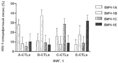 Вакцины по настоящему изобретению, специфичные в отношении ВИЧ-1 субтипов А, В, С или Е, демонстрировали высокую CTL киллинговую активность in vitro (28-37%) с вирусными штаммами совместимого субтипа (n=10), тогда как обнаружили лишь незначительную (5-17%) киллинговую активность со штаммами перекрестного субтипа (Р меньше 0,001). Хотя в отдельных случаях обнаружили киллинговую активность для несовместимого субтипа, эффективность CTL киллинга широко варьировала в вирусных штаммах несовместимого субтипа (стндартное отклонение (СО)/среднее больше 50%) по сравнению с вирусными штаммами совместимого субтипа (СО/среднее меньше 20%) (Р меньше 0,001) (Фиг.1). Эти факты свидетельствуют о том, что фармацевтическая субтип-специфичная терапевтическая вакцина против ВИЧ-1 может быть приготовлена при помощи препарата инактивированного цельного вируса, имеющего чистоту в соответствии с GMP.