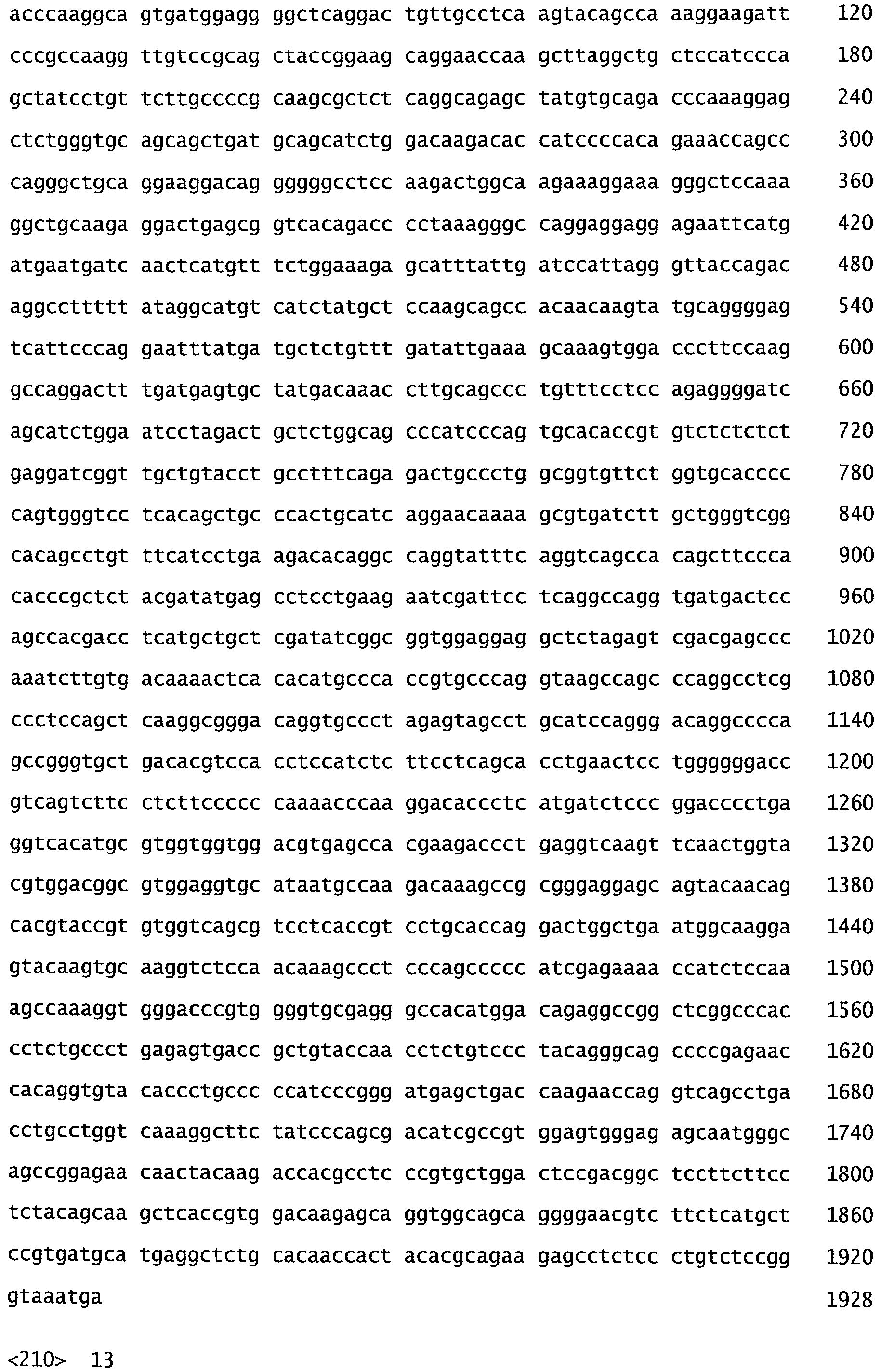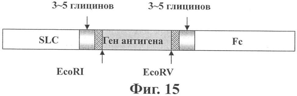 Другими словами изобретение относится к рекомбинантной генной конструкции, содержащей человеческий ген SLC, ген антигена и ген Fc-фрагмента IgG1 (см. Фиг. 13). Ген SLC помещен до гена антигена, и вставлены сайты эндонуклеазы рестрикции EcoRI и гены трех глицинов. Ген Fc-фрагмента IgG1 помещен после гена антигена, и вставлены сайты эндонуклеазы рестрикции EcoRV и гены пяти глицинов.