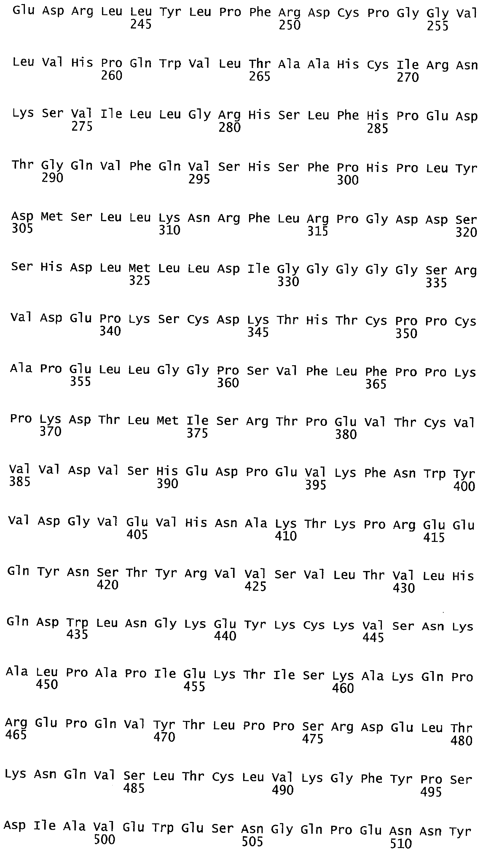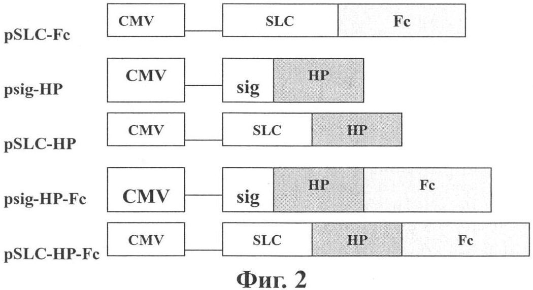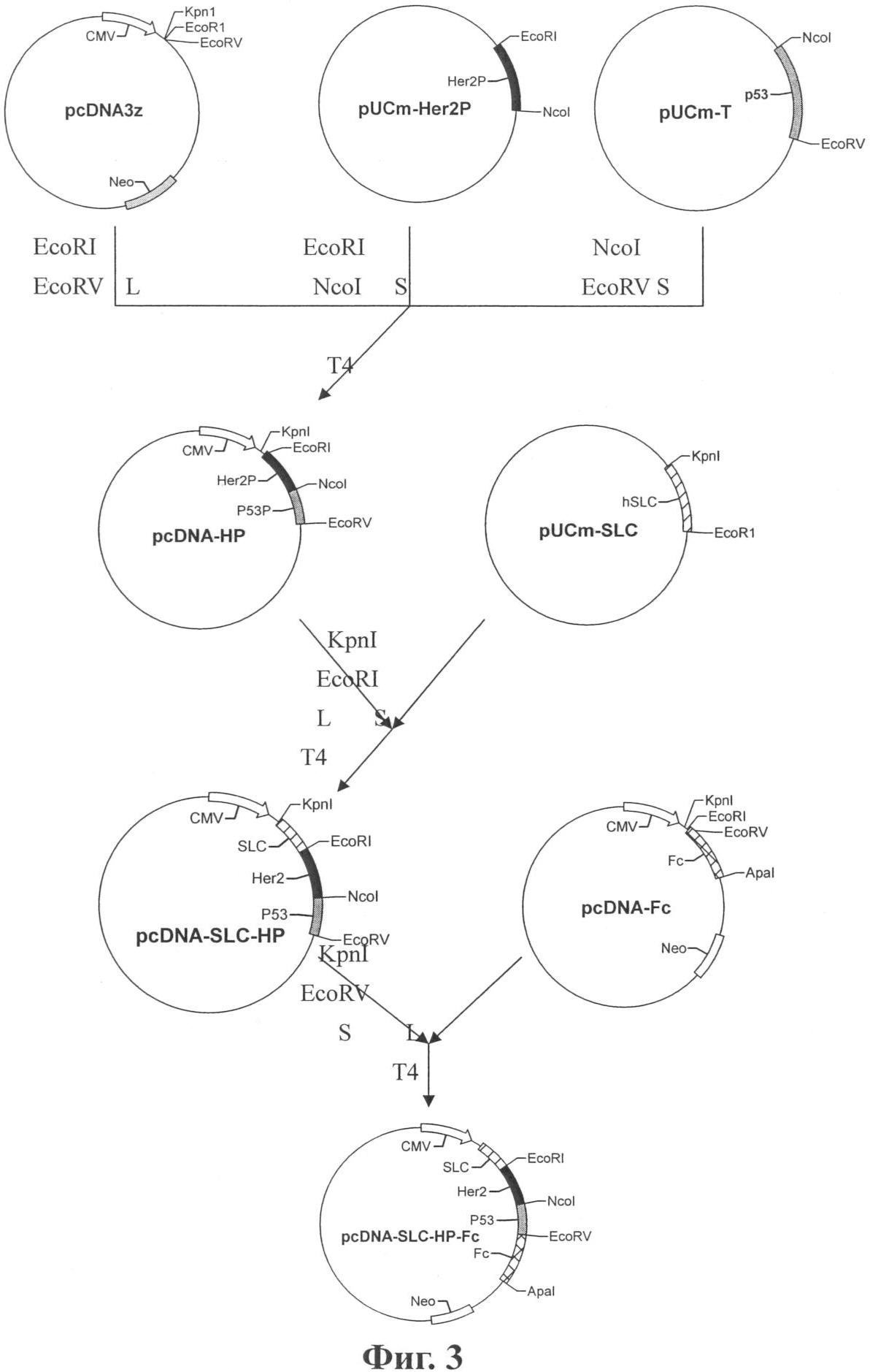 Как показано на Фиг.3, больший фрагмент из pcDNA-HP, разрезанной KpnI/EcoRI, был присоединен к меньшему фрагменту из pUC-SLC, разрезанной KpnI/EcoRI, для получения pcDNA-SLC-HP. Затем меньший фрагмент из pcDNA-SLC-HP, разрезанной KpnI/EcoRV, был присоединен к большему фрагменту из pcDNA-Fc, разрезанной KpnI/EcoRV, с получением конструкта pcDNA-SLC-HP-Fc (также названного pSLC-HP-Fc).