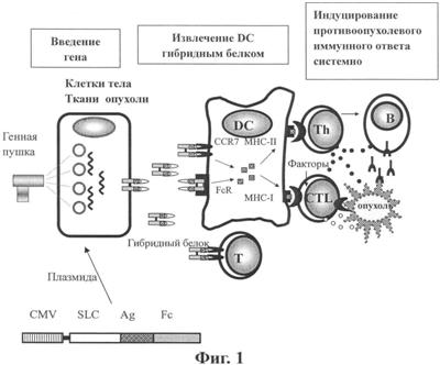 С момента открытия вторичного лимфоидного хемокина человека (SLC, от англ. secondary lymphoid tissue chemokine) ему было уделено очень много внимания. SLC регулирует секрецию цитокинов, изменяет иммуносупрессорные статусы микроокружения опухоли и способствует развитию Th1. Таким образом, SLC полезен в противоопухолевом иммунитете. Далее, SLC оказывает влияние на привлечение лимфоцитов и дендритных клеток (DC, от dendritic cells). Внутриопухолевая инъекция индуцирует местный и системный противоопухолевые иммунные ответы. SLC может также контролировать супрессию ангиогенеза в опухолях. Таким образом, SLC весьма полезен в иммунотерапии рака. Однако применение белка SLC самого по себе или трансгенный метод не дали удовлетворительных результатов в отношении противоопухолевого иммунитета. Предполагалось (Cancer Research 61, 197-205, January 1, 2001), что противоопухолевая иммунная реакция может быть усилена с помощью иммунизации мышей дендритными клетками, которые трансфицированы рекомбинантным ретровирусным вектором, несущим гены, кодирующие фрагмент IgG Fc и антиген опухоли. Механизм заключается в том, что гибридный белок, экспрессирующийся и секретирующийся из DC, повторно захватывается дендритными клетками через рецептор Fc (обозначен далее как FcR), и затем эпитоп гибридного белка презентируется Т-хелперным клеткам (Th) через молекулы МНС класса II и перекрестно презентируется цитотоксическим Т лимфоцитам (CTL) через молекулы МНС класса I, в результате чего индуцируется системно противоопухолевый гуморальный-и-клеточный иммунитет. Сообщалось (the Journal of Immunology, 1998, 161: 6059-6067), что способность DC no захвату антигенов с помощью FcR-опосредованного эндоцитоза в 10000 раз выше, чем с помощью пиноцитоза. Однако выделение, амплификация и трансфекция гена в DC увеличивает сложность производства вакцины. В этом случае дендритные клетки должны готовиться индивидуально, что затрудняет контроль качества и промышленное производство.