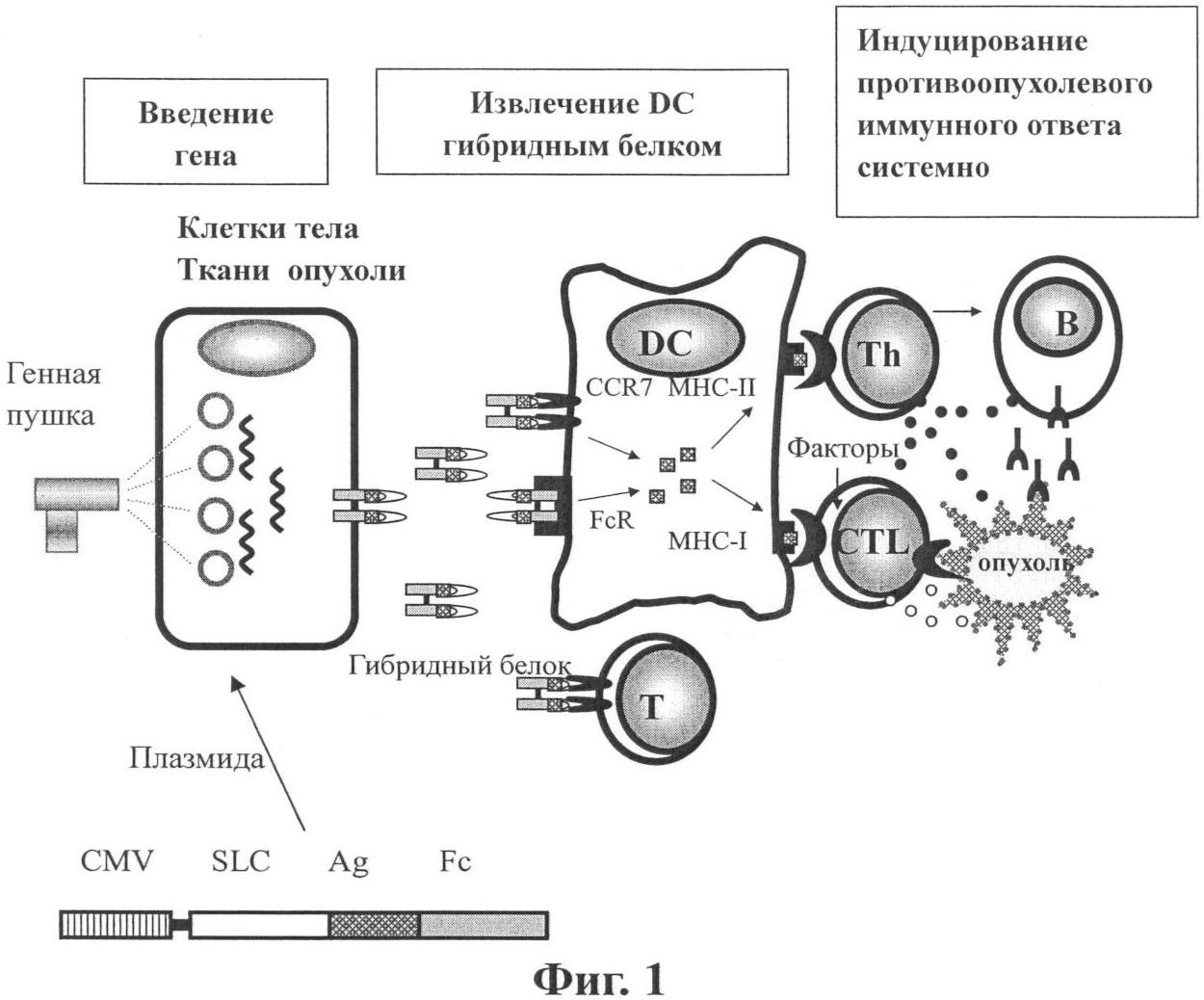 Как может быть видно из вышесказанного, стратегия для хемотаксического антигена по изобретению является следующей: присоединение хемокина SLC слева от антигена и присоединение Fc иммуноглобулина IgG справа от антигена; введение гибридного гена, состоящего из трех частей, непосредственно в здоровую или опухолевую ткань для экспрессии и секреции; образование состоящего из двух частей объединенного тела через шарнирную область Fc. Указанный рекомбинантный белок активно привлекает DC и Т клетки благодаря хемотаксической активности SLC in vivo. DC захватывает гибридный белок с высокой эффективностью с помощью пиноцитоза, особенно с помощью рецептора Fc и SLC рецептора CCR7. При этом DC несет антиген в клетку. После процессинга и обработки антиген представляется Th и CTL с помощью молекул MHC-II или MHC-I. И, наконец, полностью индуцируется специфический противоопухолевый гуморальный и клеточный иммунный ответ. Кроме того, DC может быть активирована комбинацией фрагмента Fc с Fc рецептором DC. SLC может активно извлекать DC и Т лимфоциты, а также способствовать секреции цитокинов, таких как ИЛ-12, интерферон- и интерферон-индуцируемый белок (IP-10), способствовать развитию Th1, подавлять продуцирование TGF- и VEGF. Таким образом, SLC очень полезен для противоопухолевого иммунитета. По вышеописанным причинам такая комбинация обладает синергическим эффектом и может индуцировать более сильный противоопухолевый иммунный ответ (см. Фиг.1).