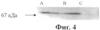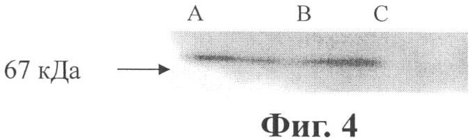 Фиг.4 показывает определение вестерн-блотингом клеточной экспрессии и секреции гибридного белка в клетках, трансфицированных генной вакциной pSLC-HP-Fc. А обозначает лизаты клеток, трансфицированных pSLC-HP-Fc; В обозначает супернатант культуры клеток, трансфицированных pSLC-HP-Fc; С обозначает супернатант культуры клеток, трансфицированных pcDNA.