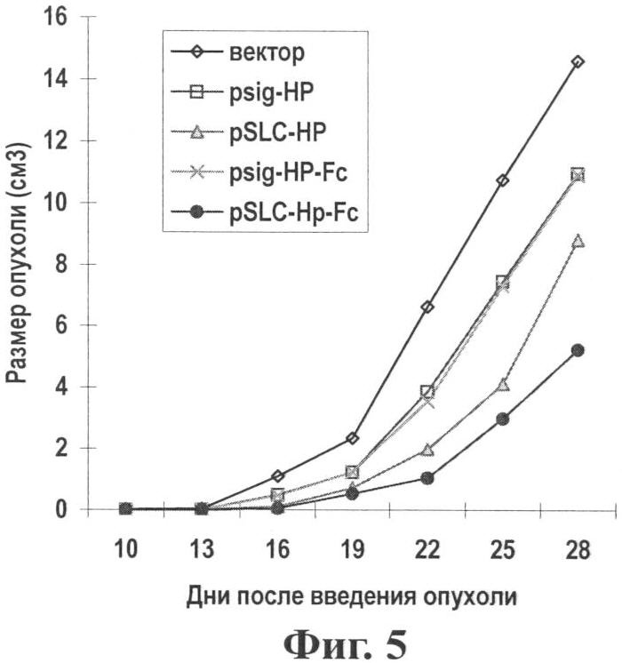 За 14 дней и за 7 дней до введения опухоли мышей вакцинировали дважды pSLC-HP-Fc или контрольными векторами в кожу брюшного отдела. На день 0 каждой мыши ввели 5×104 опухолевых клеток B16F10 (B16F10 клетки были трансфицированы геном HP и отобраны на G418) в 0,2 мл раствора. Размер опухоли записывали 2-3 раза в неделю. Размер опухоли подсчитывали в виде длина (см) × ширина (см2).