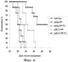 5×104 клеток рака В16-3P (трансфицированные pcDNA-3P клетки рака В16, отобранные на G418) были введены в бок мышам C57BL/6 (восемь мышей в каждой группе). Мыши были иммунизированы на третий, восьмой и тринадцатый день после введения клеток опухоли. В контрольных группах были использованы контрольные векторы pSLC-Fc и psig-3P (плазмида, содержащая ген сигнального пептида SLC слева от гена 3P). Наблюдали за размерами опухоли и временем выживания.