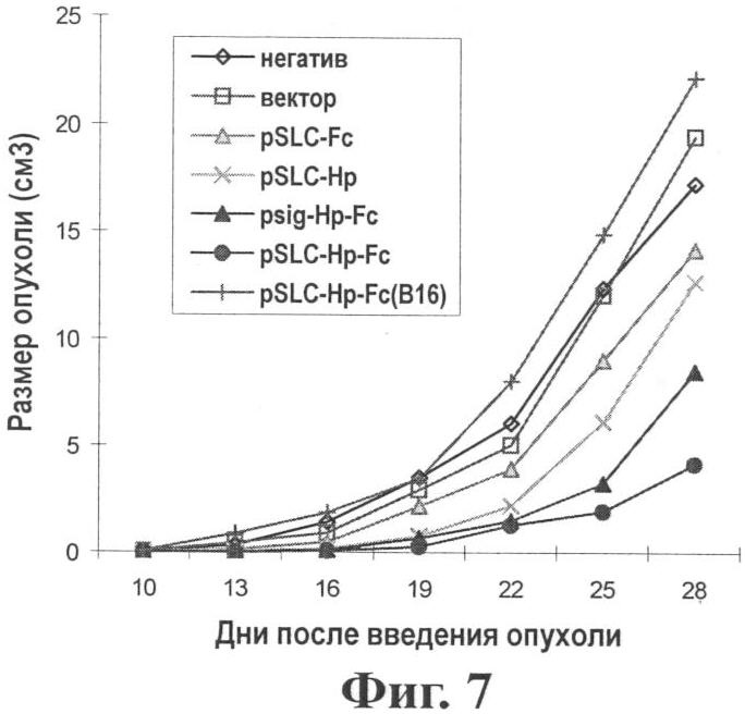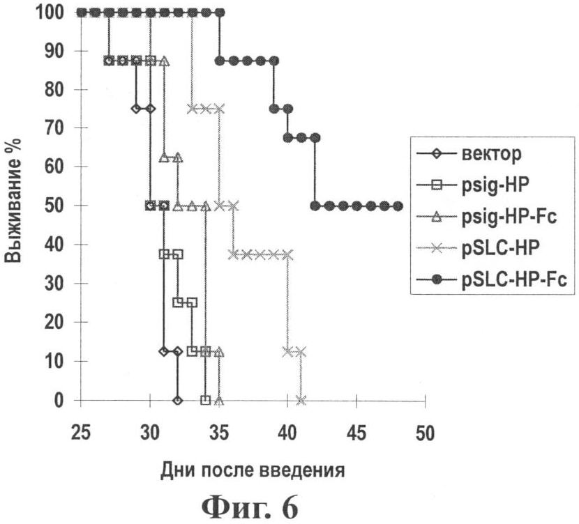 Результаты: Вакцинация дважды с помощью pSLC-HP-Fc значительно улучшала эффект подавления опухоли (см. Фиг.5, 6), и среднее время выживания мыши значительно продлялось. Терапевтический эффект pSLC-HP-Fc значительно лучше, чем у других векторов (р<0,05), что указывает на синергическое иммунное действие фрагментов SLC и Fc.