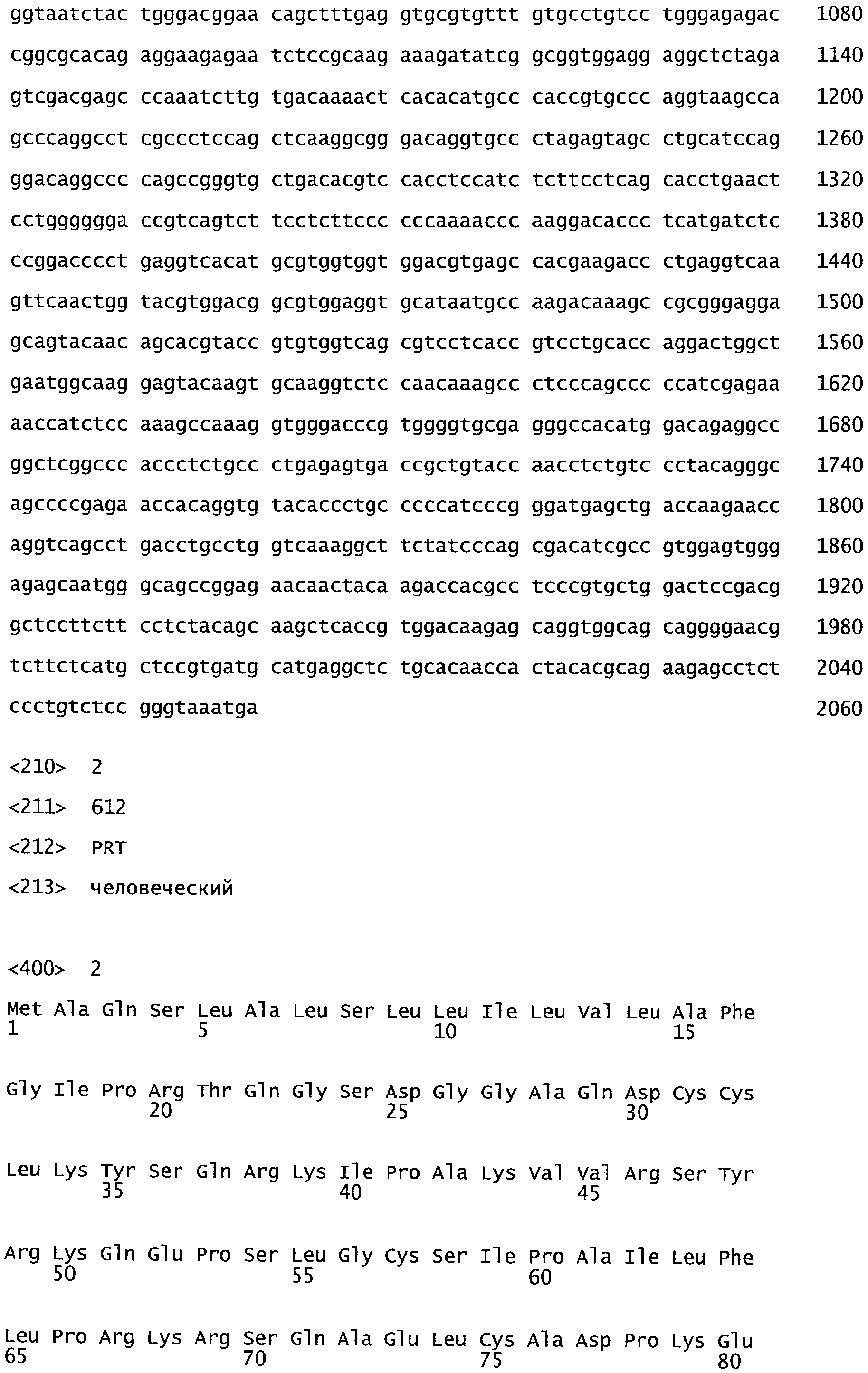Данное изобретение также относится к аминокислотной последовательности (612 а.к., зрел589а.к.) SEQ ID NO:2, кодируемой нуклеотидной последовательностью SEQ ID NO:1, где SEQ ID NO:1 представляет собой искусственно рекомбинантный SLC-Her2/P53-Fc ген. В указанной аминокислотной последовательности фрагмент SLC находится с положения 1 до положения 134, три глицина находятся с положения 135 до положения 137, и часть пептида Неr2 находится с положения 140 до положения 237. Аминокислоты с положения 140 до положения 148 в гибридном белке соответствуют аминокислотам с положения 369 до положения 377 в Her2/neu. Аминокислоты с положения 149 до положения 182 в гибридном белке соответствуют аминокислотам с положения 82 до положения 115 в Her2/neu, где имеется мутация с V на L в положении 84. Аминокислоты с положения 183 до положения 238 в гибридном белке соответствуют аминокислотам с положения 445 до положения 499 в Her2/neu. Часть пептида Р53 находится с положения 238 до положения 371 в гибридном белке (соответствуя аминокислотам с положения 159 до положения 292 в природной форме Р53). Пять глицинов находятся с положения 374 до положения 378. IgG Fc находится с положения 383 до положения 612, где последовательность с положения 383 до положения 396 представляет собой петлю С-области, последовательность с положения 397 до положения 506 является последовательностью для СН2, и последовательность с положения 507 до положения 612 является последовательностью для СН3.