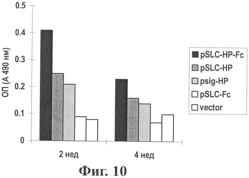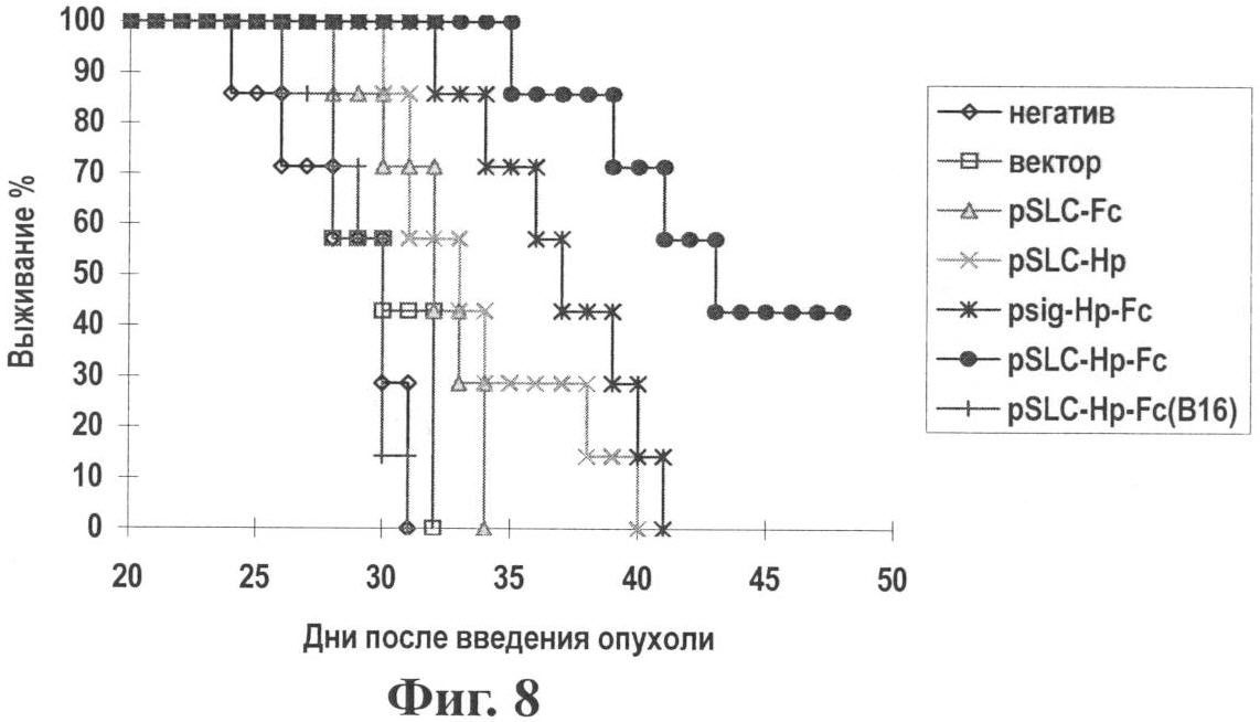 Результаты: Как показано на Фиг.7 и 8, вакцина pSLC-HP-Fc демонстрирует наиболее эффективное подавление роста опухоли. На день 28 разница между группами pSLC-HP-Fc и psig-HP-Fc является значительной (Р<0,05). Среднее время выживания мыши продлялось при иммунизации pSLC-HP-Fc. Мышам в группе В16 (pSLC-HP-Fc) вводили клетки В16 дикого типа. После трех иммунизаций pSLC-HP-Fc, группа В16 показала отсутствие эффекта супрессии опухоли, означая, что иммунный ответ, индуцированный pSLC-HP-Fc, является специфичным к HP антигену.