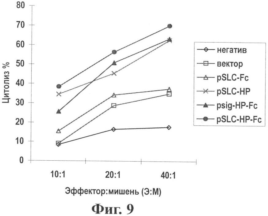 Фиг.9 показывает активность CTL после иммунизации генной вакциной опухоль-хемотаксического антигена (pSLC-HP-Fc).
