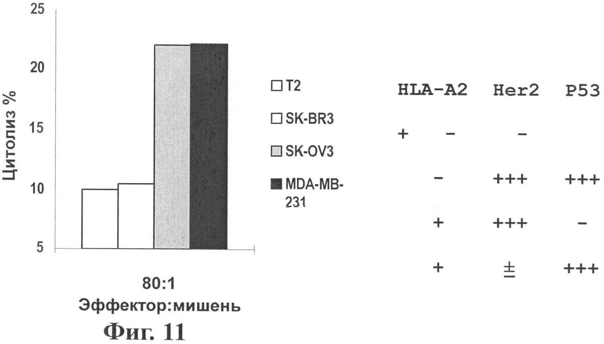 Результаты: После смешения культур трансфицированные pSLC-HP-Fc MNC индуцировали специфичный CTL, чтобы убить клетки опухоли, которые сверхэкспрессируют Her2/neu или р53 МНС-рестриктирующим образом (см. Фиг.11). То есть только специфичные CTL в значительной степени убивают HLA-A2+ клетки опухоли, которые экспрессируют Her2/neu или р53, указывая на специфичность CTL, индуцированных генной вакциной хемотаксического антигена.