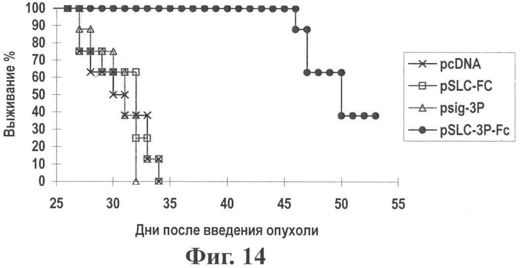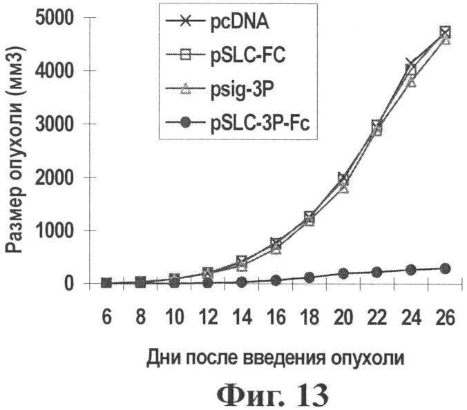 Фиг.13 показывает эффект по ингибированию опухоли in vivo после воздействия генной вакциной опухоль-хемотаксического антигена (pSLC-3P-Fc).