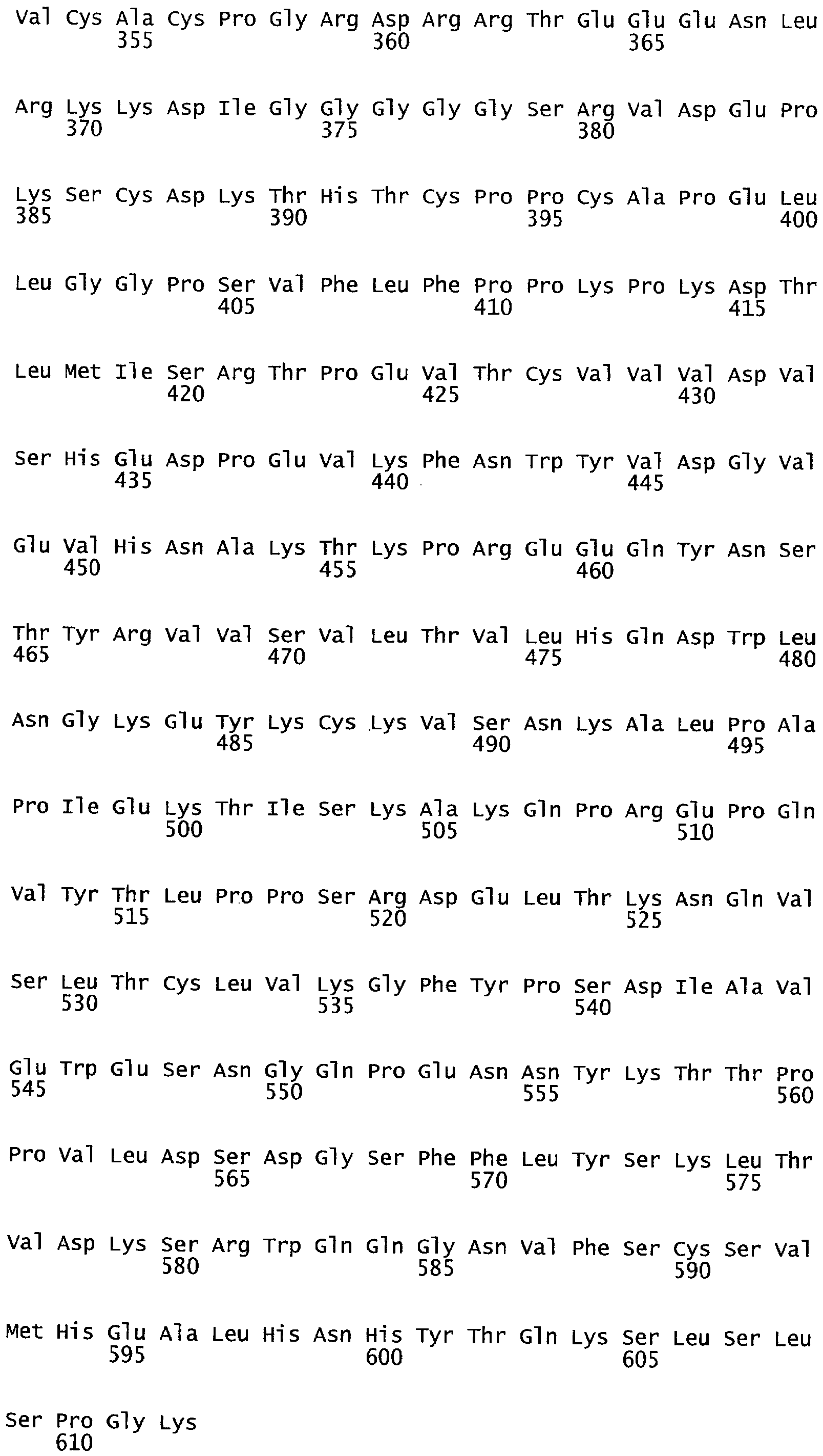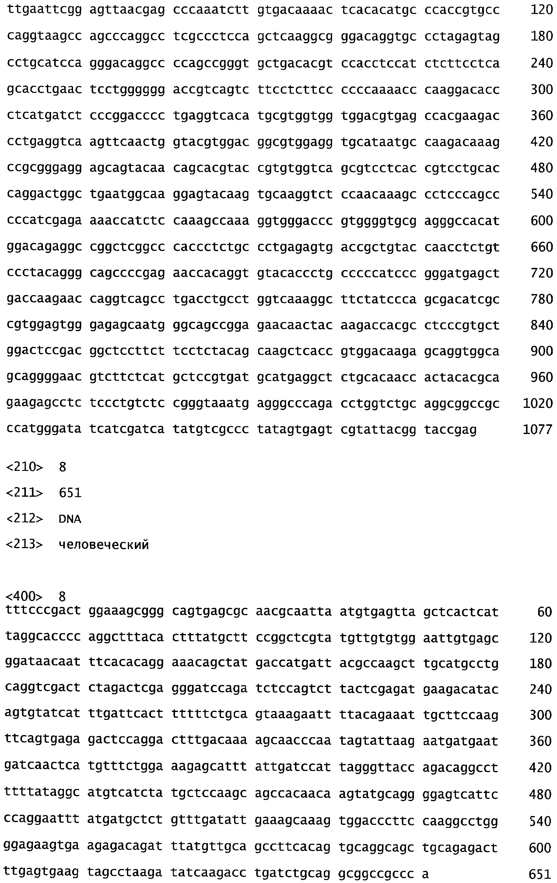 Фрагмент Fc размером 900 п.н. был амплифицирован с плазмиды, содержащей ген IgG1 Fc, с помощью ПЦР и вставлен в вектор pUCmT для секвенирования. Для амплификации использовали следующие праймеры: прямой праймер: 5′-gaattcggagttaacgagcccaaatcttg-3′; обратный праймер: 5′-gggccctcatttacccggagac-3′. Результаты секвенирования показывают, что плазмида содержит шарнирную область и области СН2 и СН3 от IgG1. Это значит, что плазмида содержит Fc (см. подчеркнутую последовательность). Результат показан в SEQ ID NO:7, где последовательность с положения 78 до положения 991 представляет собой последовательность по изобретению.