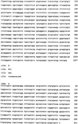 Тотальная РНК была экстрагирована из клеточной линии человеческого рака простаты LNCaP. ОТ-ПЦР была осуществлена с использованием прямого праймера (5′-ACTCGAGAT GAAGACATACAGTGTATC-3′) и обратного праймера (5′-TGATATCTTAGGCTAC TTCACTCAAAG-3′). После электрофореза была вырезана полоса hPSM размером 390 п.н. Фрагмент был очищен и извлечен методом Glass Milk. Очищенный фрагмент был лигирован в вектор pUCm-T с получением pUCm-hPSM. Положительный клон были взят и секвенирован. Результаты соответствуют ожидаемым. Если взглянуть на SEQ ID NO: 8, полученный фрагмент гена соответствует последовательности с положения 1864 до положения 2253 ОРС человеческого PSM. Последовательность с положения 229 до положения 618 в полученной последовательности является последовательностью по изобретению.
