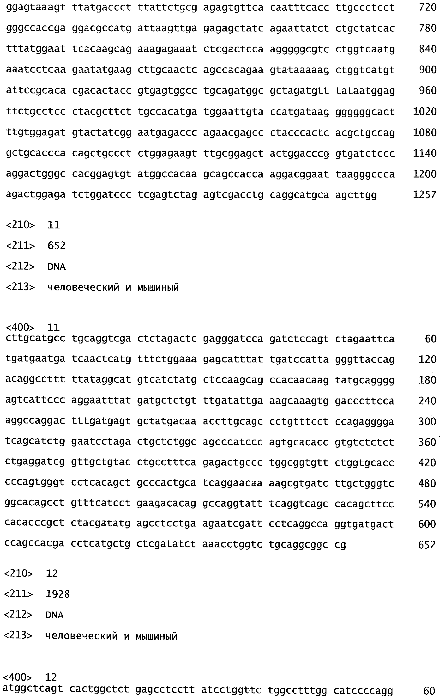Данное изобретение также относится к другому рекомбинантному гену для вакцины против рака простаты, последовательность которого показана в SEQ ID NO: 12. Нуклеотидная последовательность SEQ ID NO: 12 представляет собой последовательность искусственно лигированного SLC-PSM-mPAP-PSA-Fc (SLC-3Р-Fc) гена, куда введены только частичные последовательности PSM (human Prostate Specific Membrane Antigen), mPAP (mouse Prostatic Acid Phosphatase) и PSA (human Prostate Specific Antigen). В гибридом гене ген SLC находится с положения 1 до положения 402; часть гена PSM находится с положения 418 до положения 603, соответствуя последовательности с положения 1987 до положения 2172 в открытой рамке считывания (ОРС) PSM; ген mPAP находится с положения 604 до положения 759, соответствуя последовательности с положения 328 до положения 484 в mPAP ОРС; ген PSA находится с положения 760 до положения 981, соответствуя последовательности с положения 151 до положения 372 в PSA ОРС; ген IgG Fc (включая интроны) находится с положения 1003 до положения 1925, причем эти два интрона находятся с положения 1057 до положения 1177 и с положения 1508 до положения 1607 соответственно. Гены трех глицинов и сайты EcoRI эндонуклеазы рестрикции вставлены перед (слева от) 3P, и гены пяти глицинов и сайты EcoRV эндонуклеазы рестрикции вставлены после (справа от) 3P.