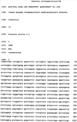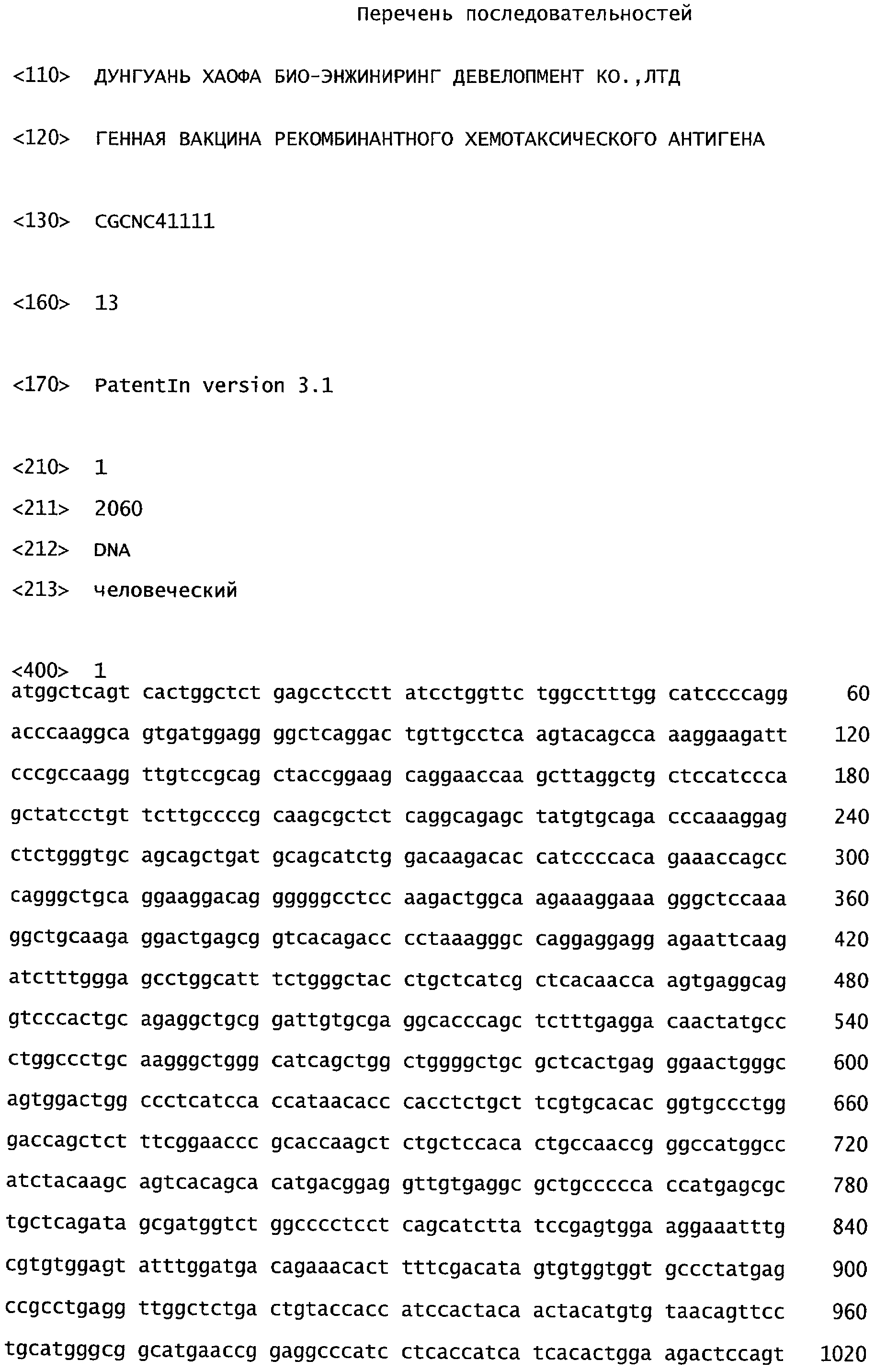 Согласно изобретению замена гена антигена в указанных генах по сайтам эндонуклеазы рестрикции может привести к различным гибридным генам хемотаксического антигена. В частности, это изобретение относится к рекомбинантному гену, содержащему последовательность нуклеиновой кислоты SEQ ID NO:1. Последовательность нуклеиновой кислоты SEQ ID NO:1 представляет собой искусственно лигированную последовательность SLC-Her2/P53-Fc, где ген SLC находится с положения 1 до положения 402 нуклеиновой кислоты; лигирующий ген Her2 находится с положения 418 до положения 711 нуклеиновой кислоты. Нуклеотиды с положения 418 до положения 444 в рекомбинантном гене соответствуют нуклеотидам с положения 1105 до положения 1131 в открытой рамке считывания (ОРС) гена Her2/neu. Нуклеотиды с положения 445 до положения 546 в рекомбинантном гене соответствуют нуклеотидам с положения 244 до положения 345 в открытой рамке считывания (ОРС) гена Her2/neu, куда включена мутация с G на С в положении 250. Нуклеотиды с положения 547 до положения 711 в рекомбинантном гене соответствуют нуклеотидам с положения 1333 до положения 1479 в ОРС гена Her2/neu. В рекомбинантном гене часть гена Р53 находится с положения 712 до положения 1113, соответствующим нуклеотидам с положения 475 до положения 876 ОРС р53. Ген IgG Fc (включая интроны) находится с положения 1147 до положения 2057 в рекомбинантном гене, причем два интрона находятся с положения 1189 до положения 1309 и с положения 1640 до положения 1739 соответственно. Последовательность нуклеиновой кислоты с положения 1147 до положения 1189 является последовательность. шарнира С-области. Последовательность нуклеиновой кислоты с положения 1310 до положения 1369 является последовательностью для СН2, последовательность нуклеиновой кислоты с положения 1740 до положения 2057 является последовательностью для СН3. Три гена глицинов и сайты EcoRI эндонуклеазы рестрикции вставлены перед фрагментом Неr2/Р53, и пять генов глицинов и сайты EcoRV эндонукпеазы рестрикции вставлены после Her2/Р53. Согласно этому изобретению, чтобы сделать нормальной биологическую функцию экспрессированных факторов, 3~5 генов глицинов вставлены перед и после (справа и слева от) гена антигена. Эффект генов глицина заключается в том, чтобы предотвратить интерференцию рекомбинантного антигена с трехмерной структурой.