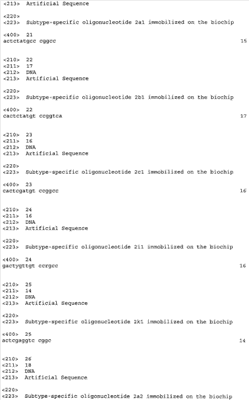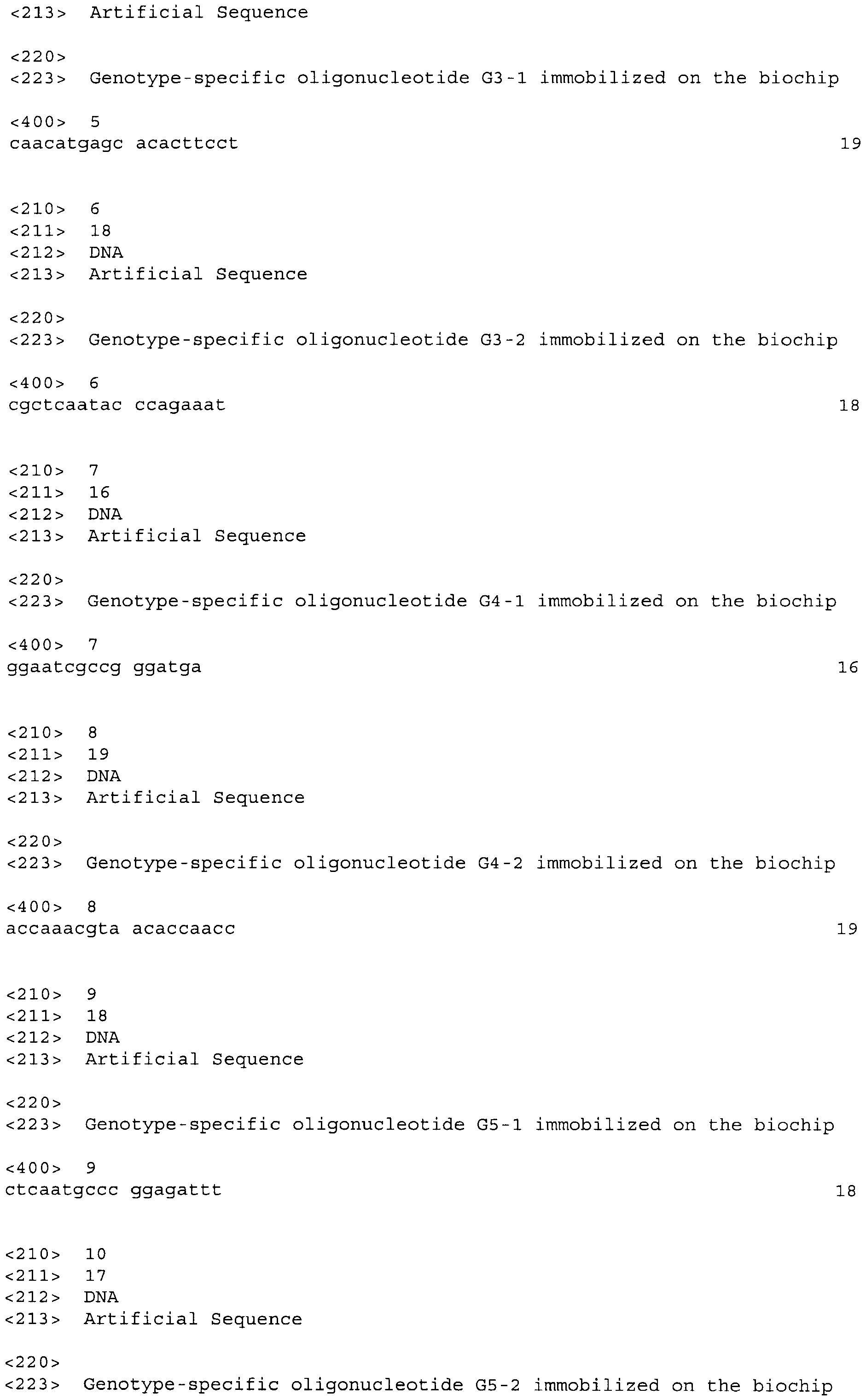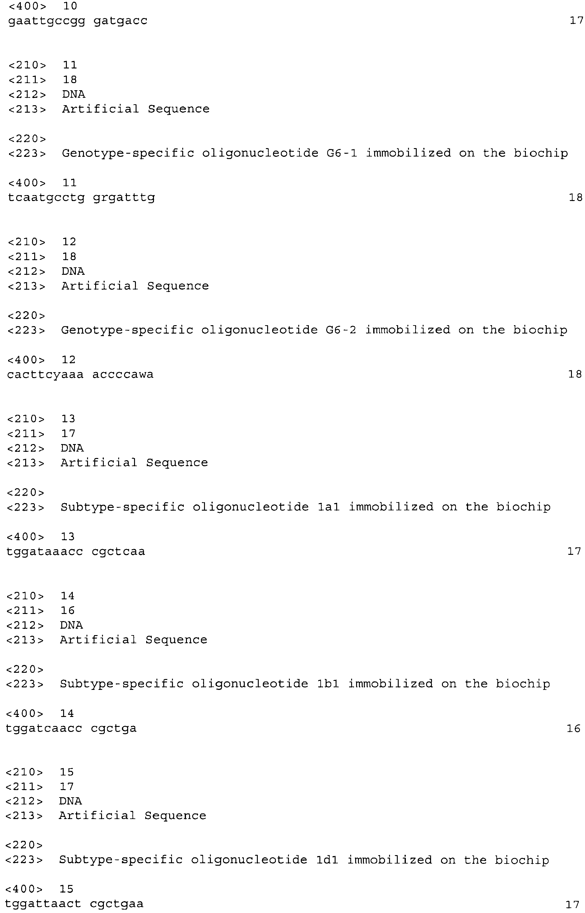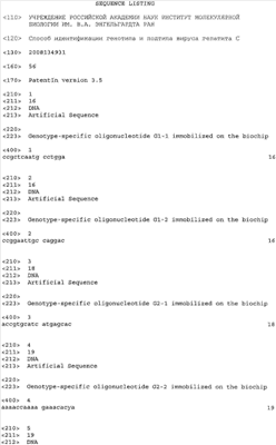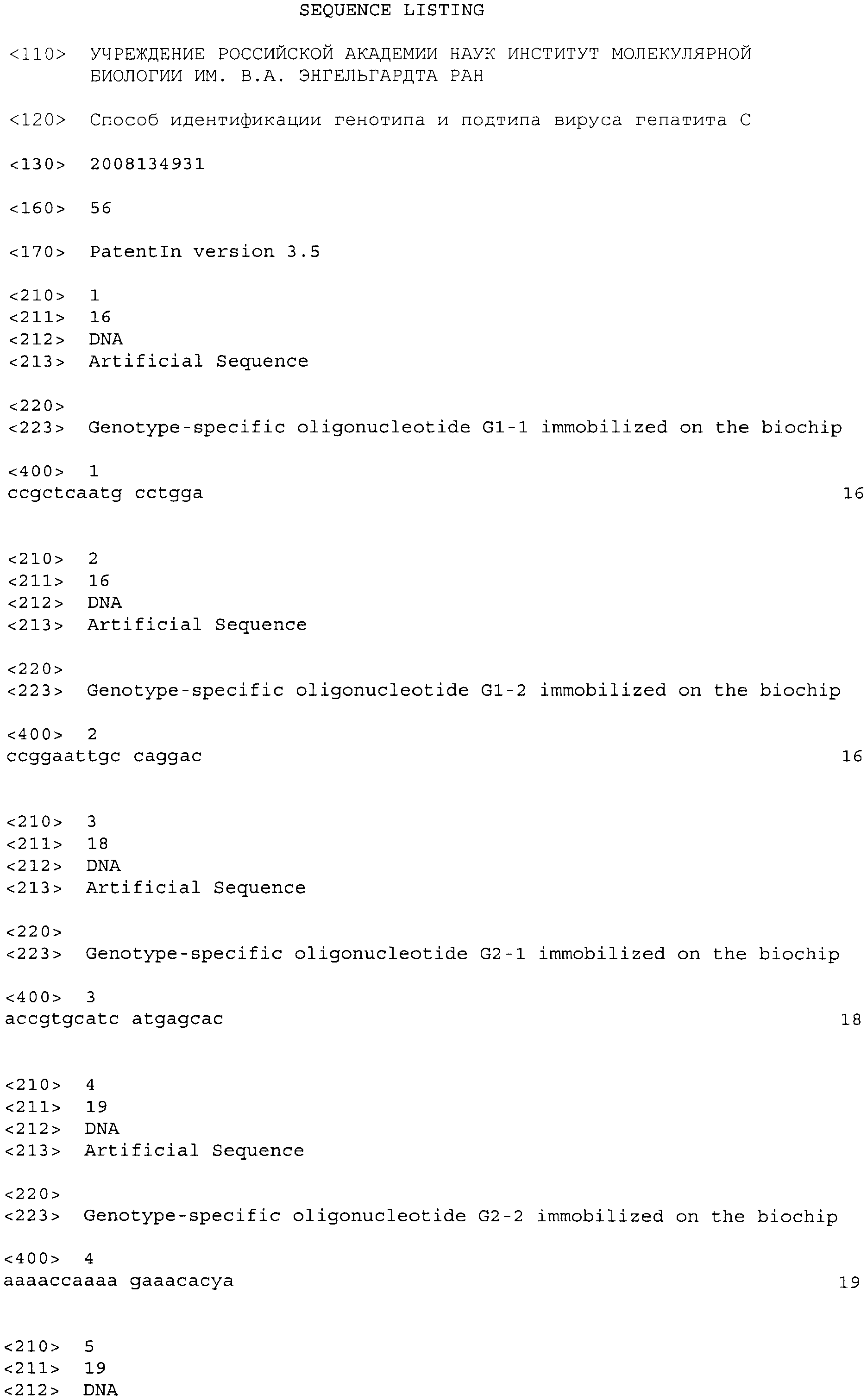 Таким образом, представленное изобретение позволяет идентифицировать генотип и подтип вируса гепатита С на основе анализа 5′-нетраслируемой области генома ВГС с использованием олигонуклеотидного микрочипа. Способ позволяет идентифицировать все 6 генотипов и 22 подтипа вируса гепатита С, в том числе наиболее вирулентные и лекарственно-устойчивые формы. Способ выгодно отличается от существующих в настоящее время аналогов высокой специфичностью в отношении идентификации подтипов генотипа 1 и 4, в частности подтипов 1b и 4d, а также простотой выполнения и низкой себестоимостью. Данные, полученные с помощью процедуры гибридизации на микрочипах настоящего изобретения, могут быть использованы для прогнозирования и оценки тяжести протекания заболевания (острый/хронический цирроз, вероятность развития рака печени), определения терапевтической дозы лекарственных препаратов и длительности курса терапии, а также для эпидемиологического генотипирования.