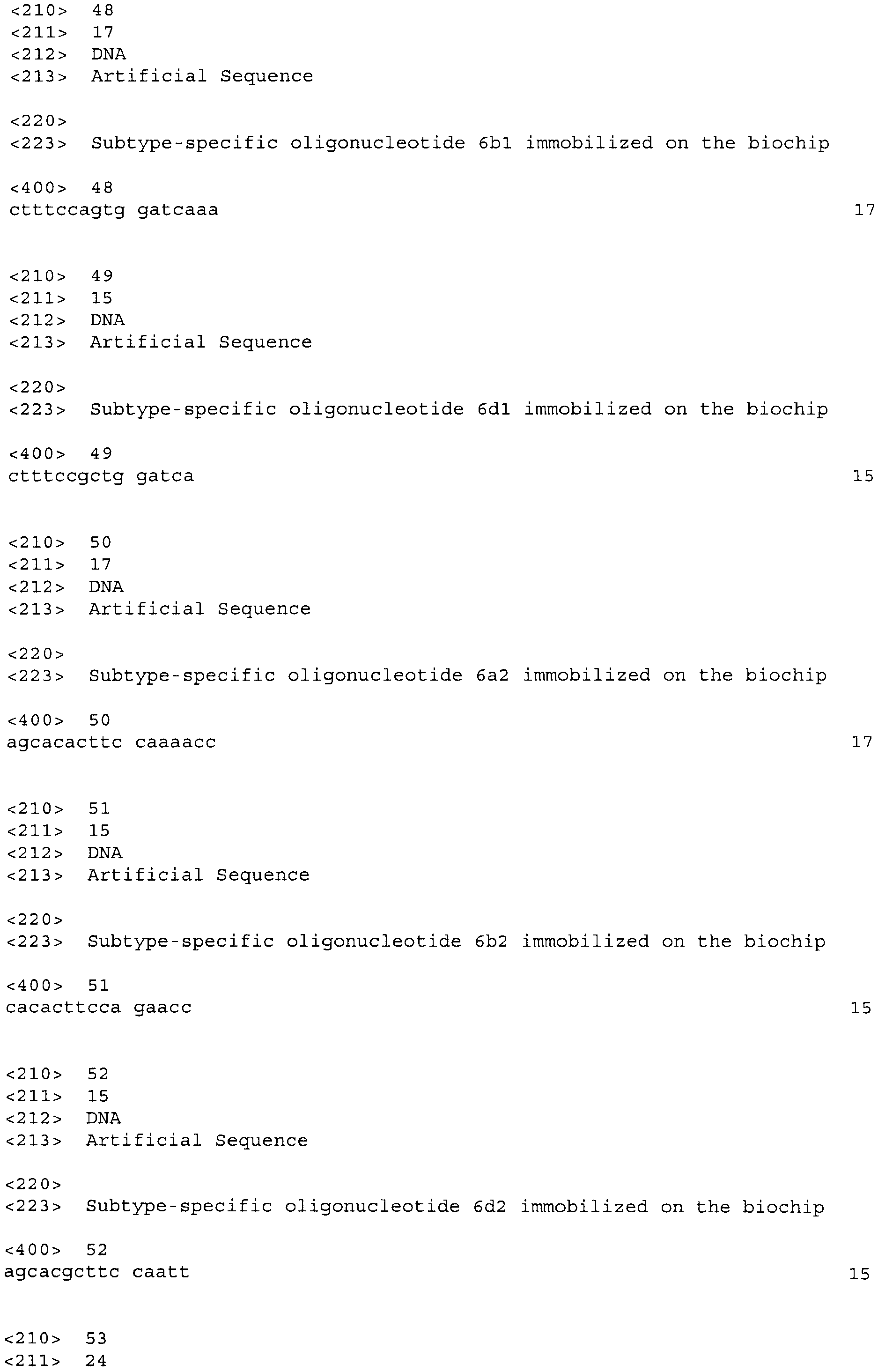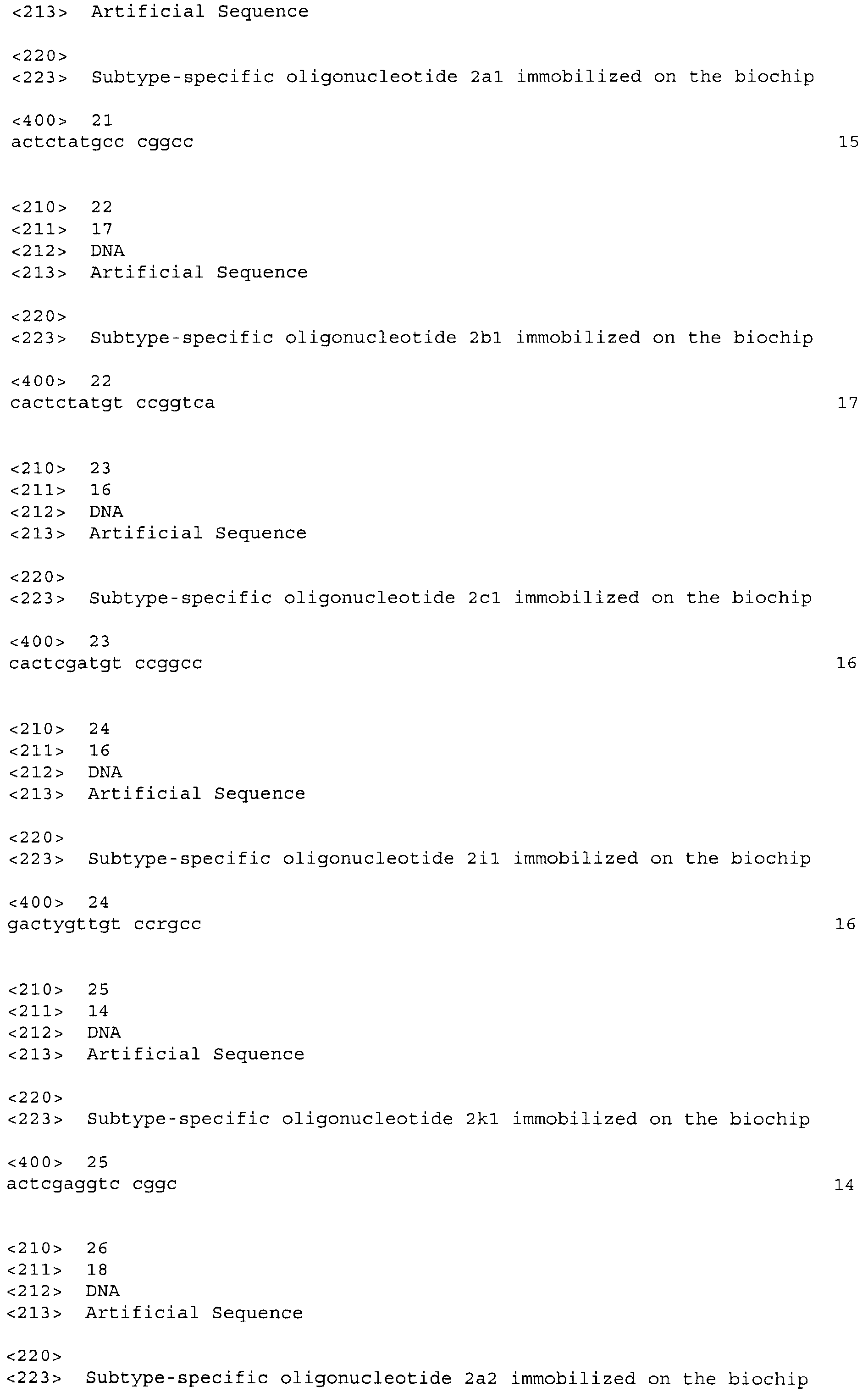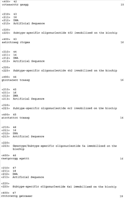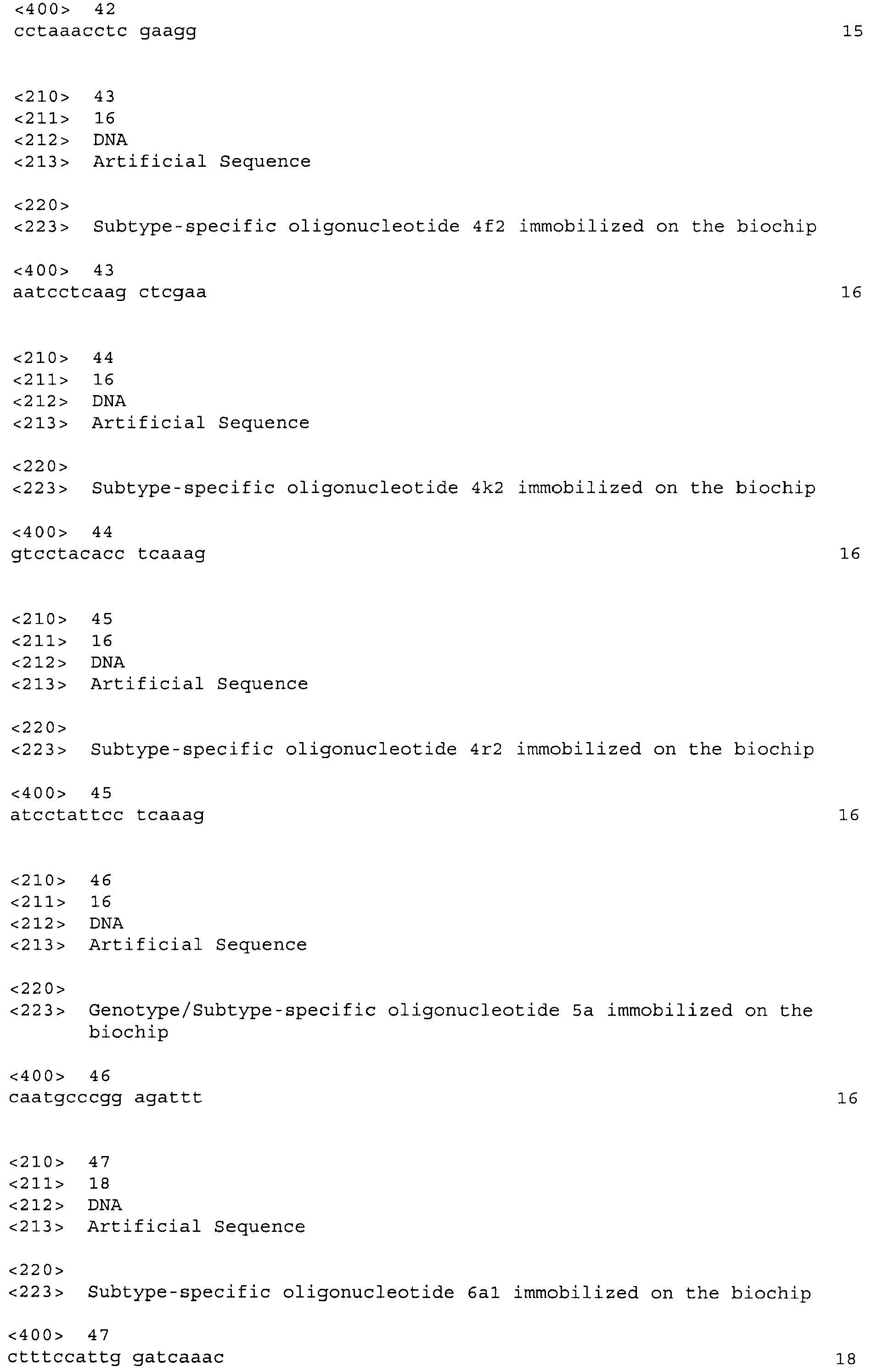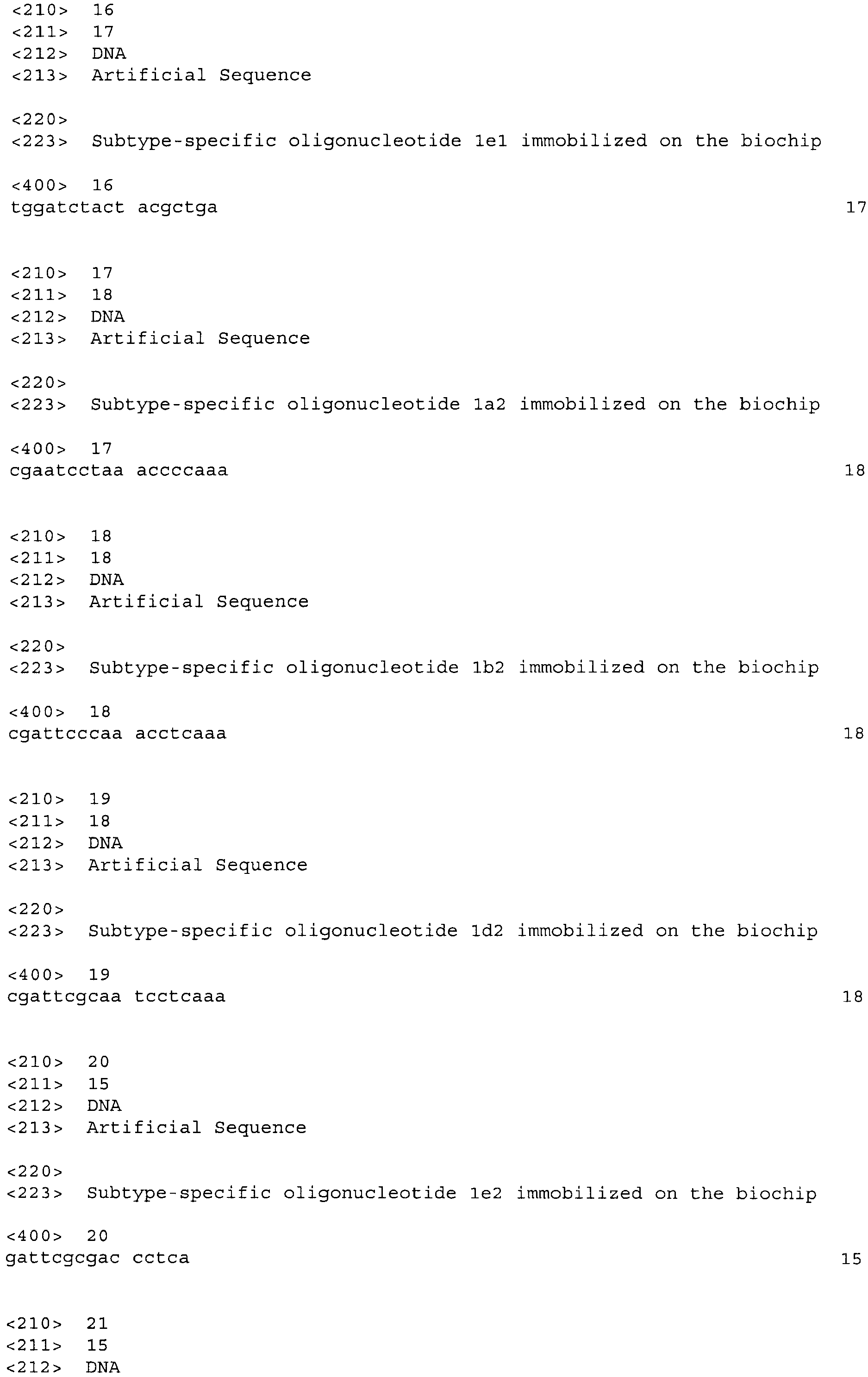 Таким образом, представленное изобретение позволяет идентифицировать генотип и подтип вируса гепатита С на основе анализа 5′-нетраслируемой области генома ВГС с использованием олигонуклеотидного микрочипа. Способ позволяет идентифицировать все 6 генотипов и 22 подтипа вируса гепатита С, в том числе наиболее вирулентные и лекарственно-устойчивые формы. Способ выгодно отличается от существующих в настоящее время аналогов высокой специфичностью в отношении идентификации подтипов генотипа 1 и 4, в частности подтипов 1b и 4d, а также простотой выполнения и низкой себестоимостью. Данные, полученные с помощью процедуры гибридизации на микрочипах настоящего изобретения, могут быть использованы для прогнозирования и оценки тяжести протекания заболевания (острый/хронический цирроз, вероятность развития рака печени), определения терапевтической дозы лекарственных препаратов и длительности курса терапии, а также для эпидемиологического генотипирования.