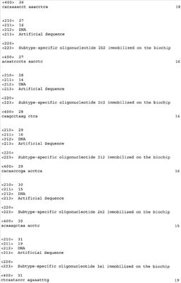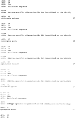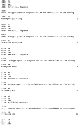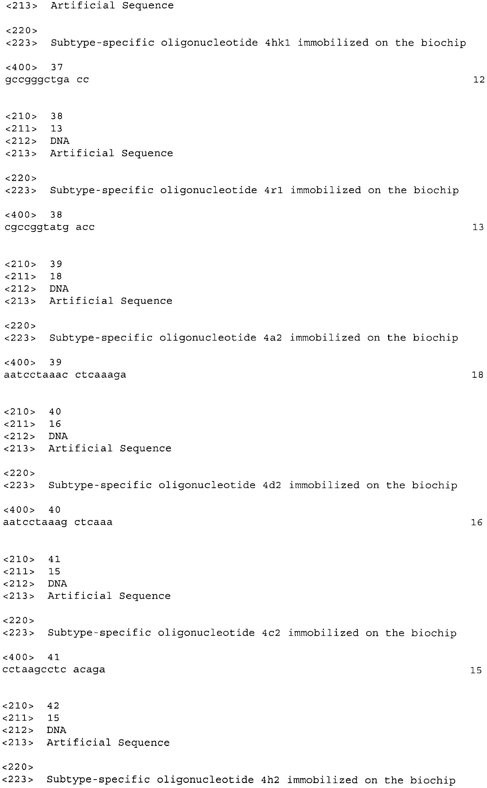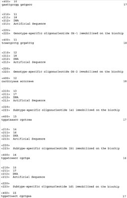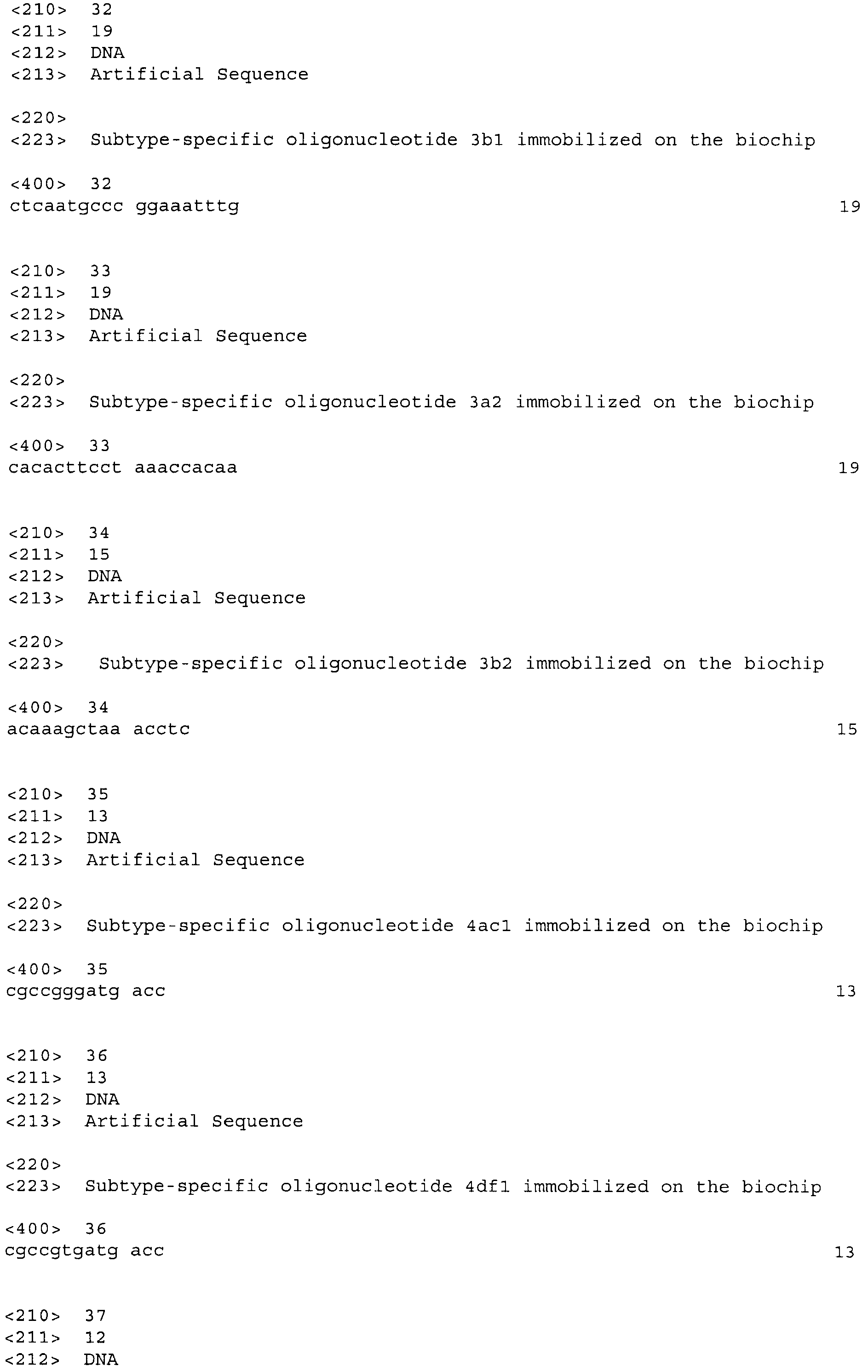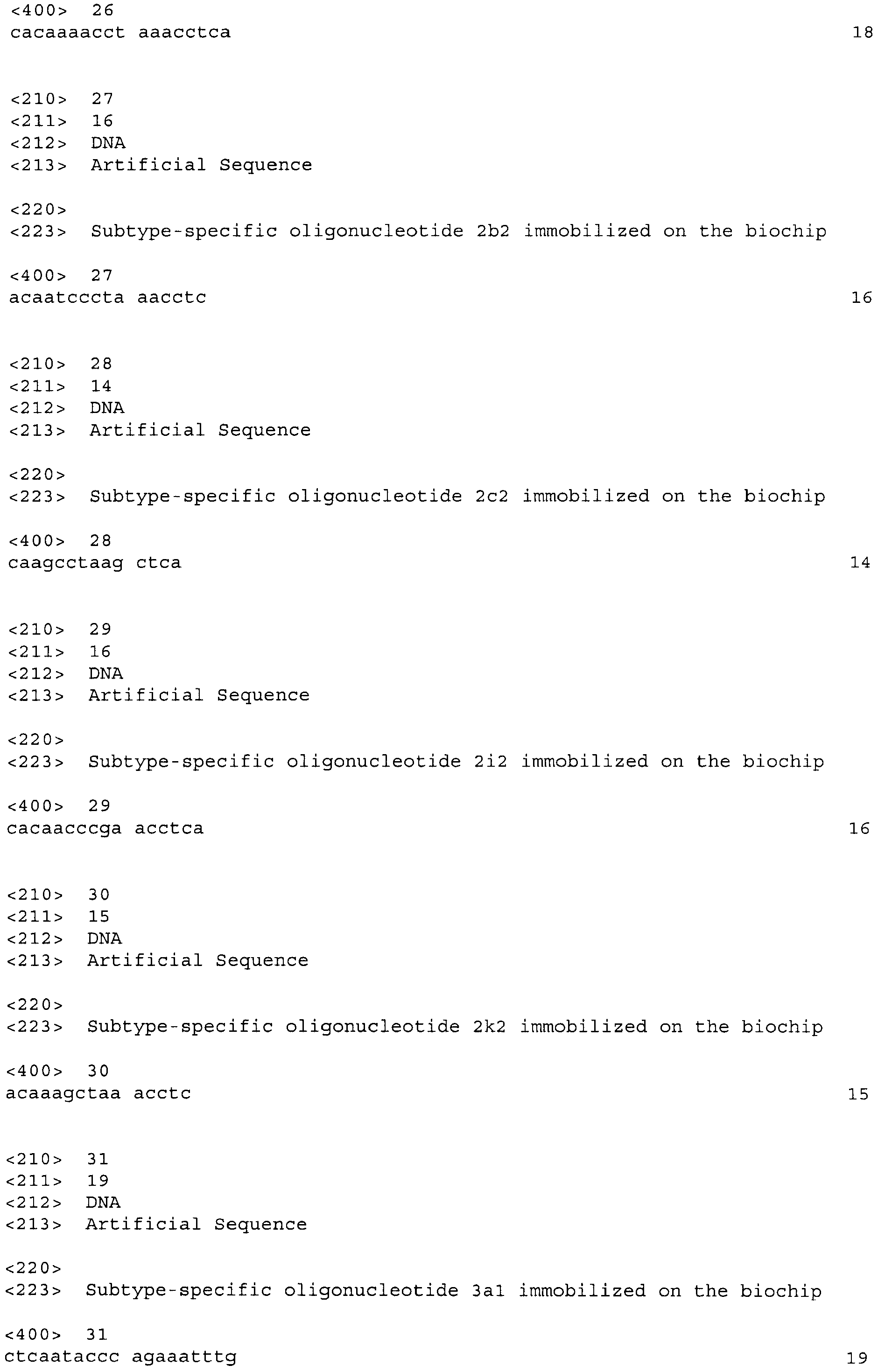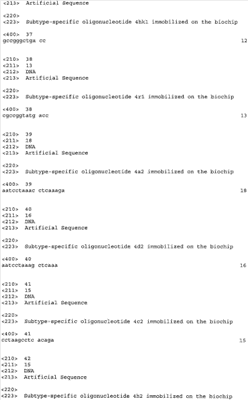 Таким образом, представленное изобретение позволяет идентифицировать генотип и подтип вируса гепатита С на основе анализа 5′-нетраслируемой области генома ВГС с использованием олигонуклеотидного микрочипа. Способ позволяет идентифицировать все 6 генотипов и 22 подтипа вируса гепатита С, в том числе наиболее вирулентные и лекарственно-устойчивые формы. Способ выгодно отличается от существующих в настоящее время аналогов высокой специфичностью в отношении идентификации подтипов генотипа 1 и 4, в частности подтипов 1b и 4d, а также простотой выполнения и низкой себестоимостью. Данные, полученные с помощью процедуры гибридизации на микрочипах настоящего изобретения, могут быть использованы для прогнозирования и оценки тяжести протекания заболевания (острый/хронический цирроз, вероятность развития рака печени), определения терапевтической дозы лекарственных препаратов и длительности курса терапии, а также для эпидемиологического генотипирования.
