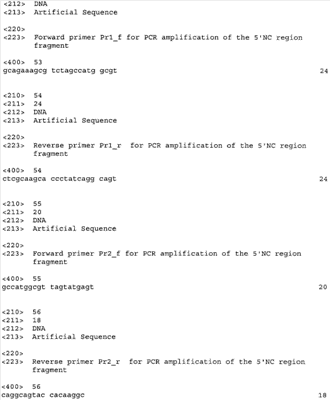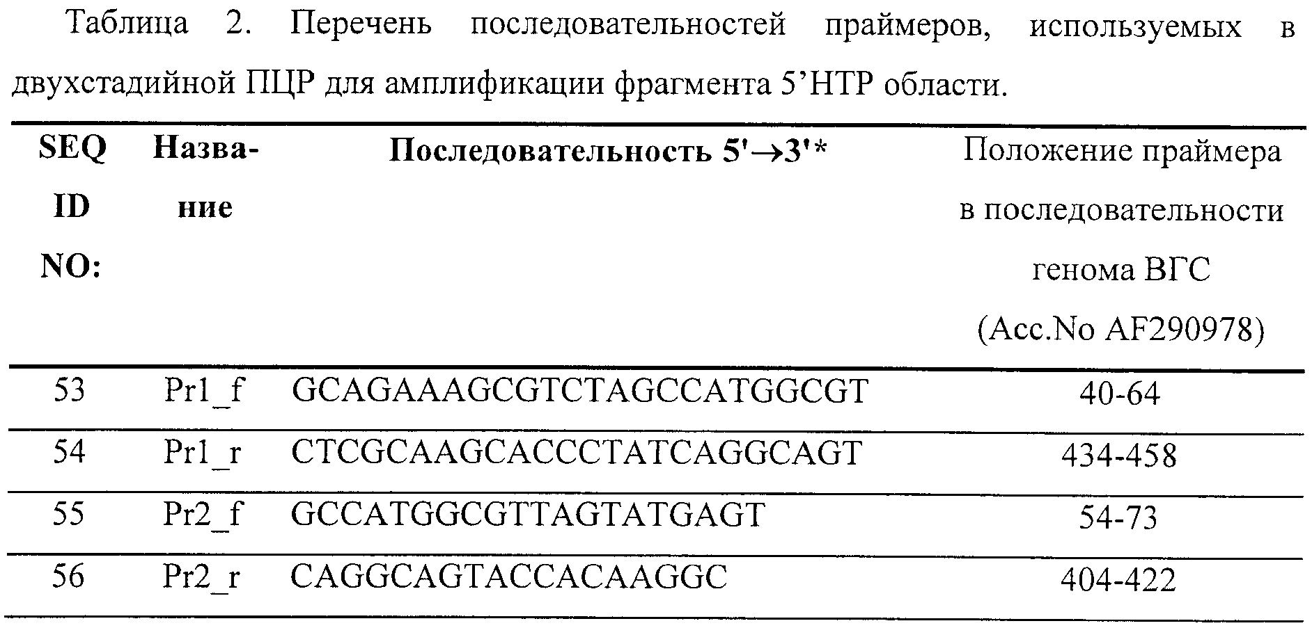 Вторую стадию ПЦР проводили в полугнездовом варианте, с праймерами P3_f/Pr5_r, фланкирующими район 5’НТР области длиной 382 п.о. Последовательности праймеров приведены в таблице 2.