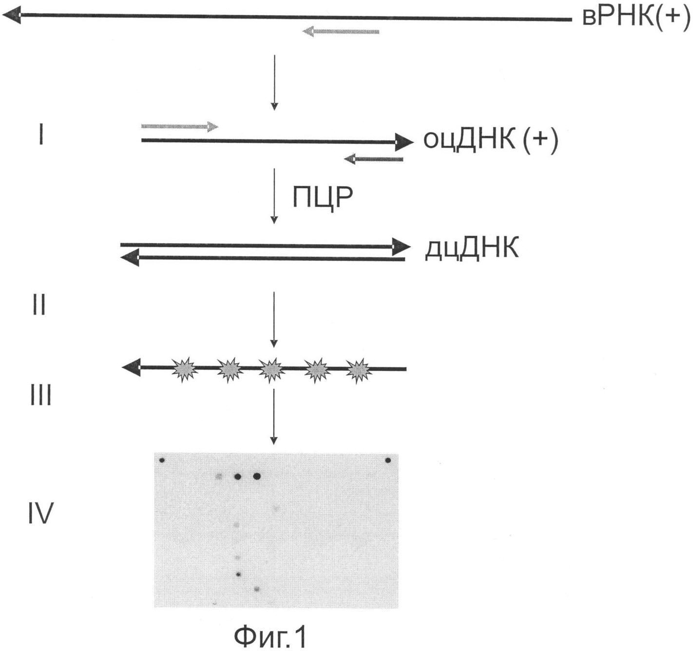 Фиг.1 представляет принципиальную схему проведения анализа РНК ВГС с целью идентификации генотипа и подтипа ВГС на олигонуклеотидном микрочипе. Обозначения: