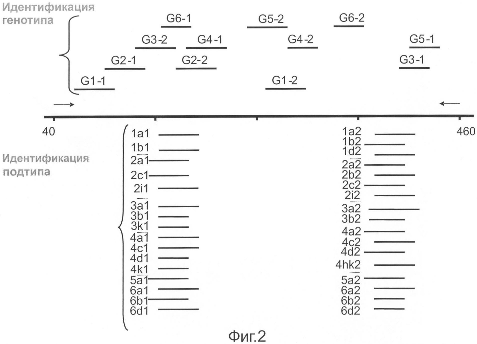 Фиг.2 представляет схему выбора олигонуклеотидов для идентификации генотипов и подтипов ВГС.