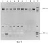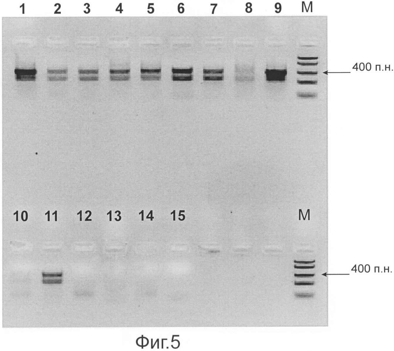 Фиг.5 представляет результаты проведения стадии ПЦР с праймерами, последовательности которых представлены SEQ ID NO: 55 и 56, с использованием в качестве матрицы продукта стадии ОТ-ПЦР, для образцов ВГС, имеющих различные генотипы и подтипы. Обозначения (дорожки геля):