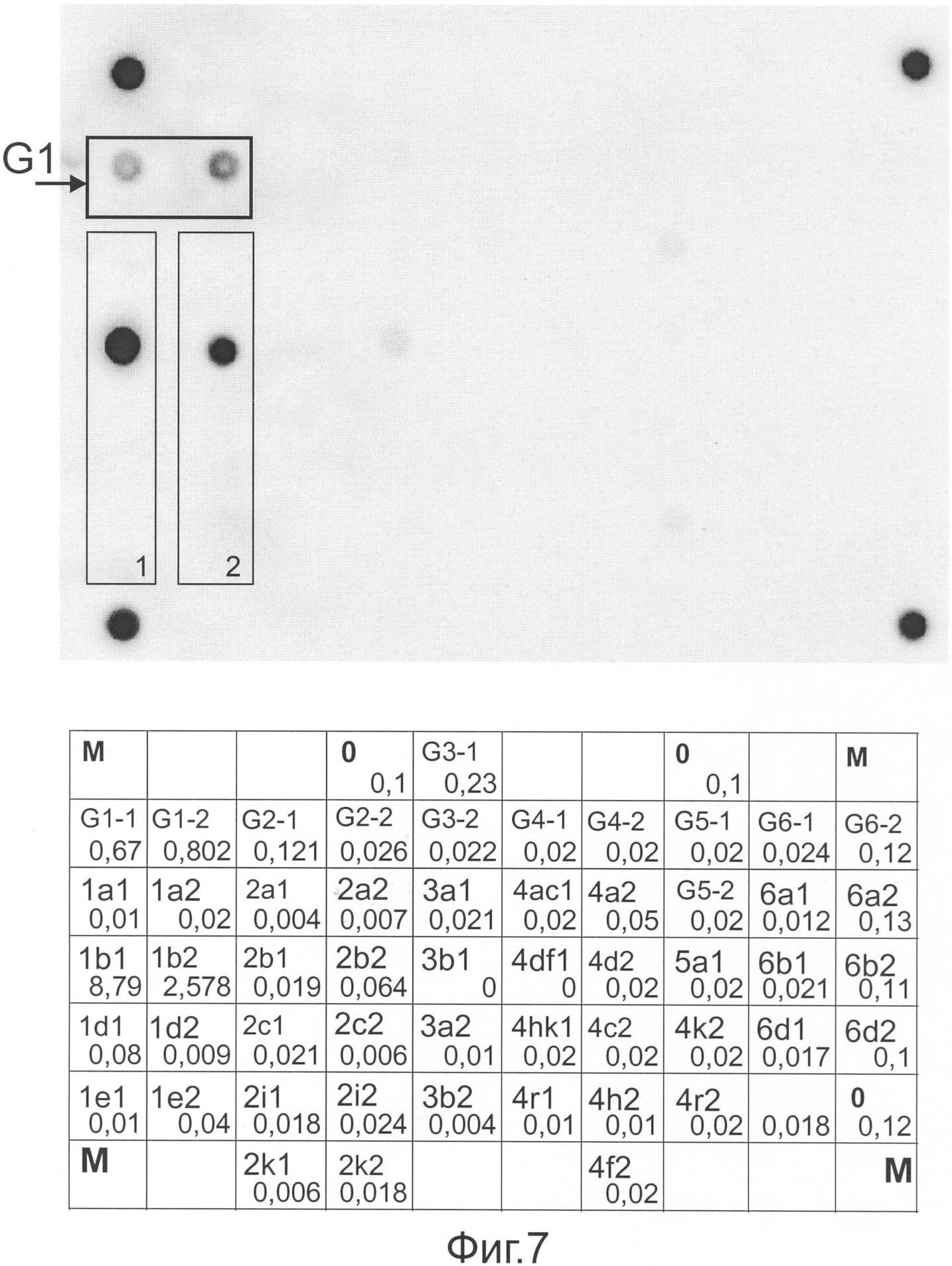 На фиг.7 представлены гибридизационная картина микрочипа и распределение нормированных гибридизационных сигналов ячеек микрочипа.