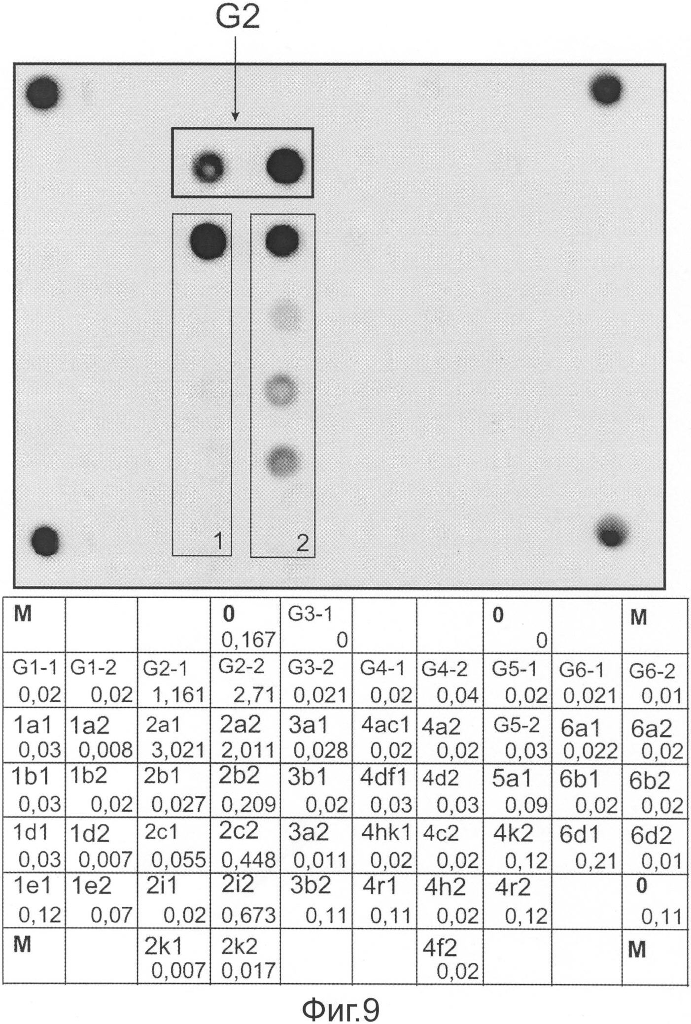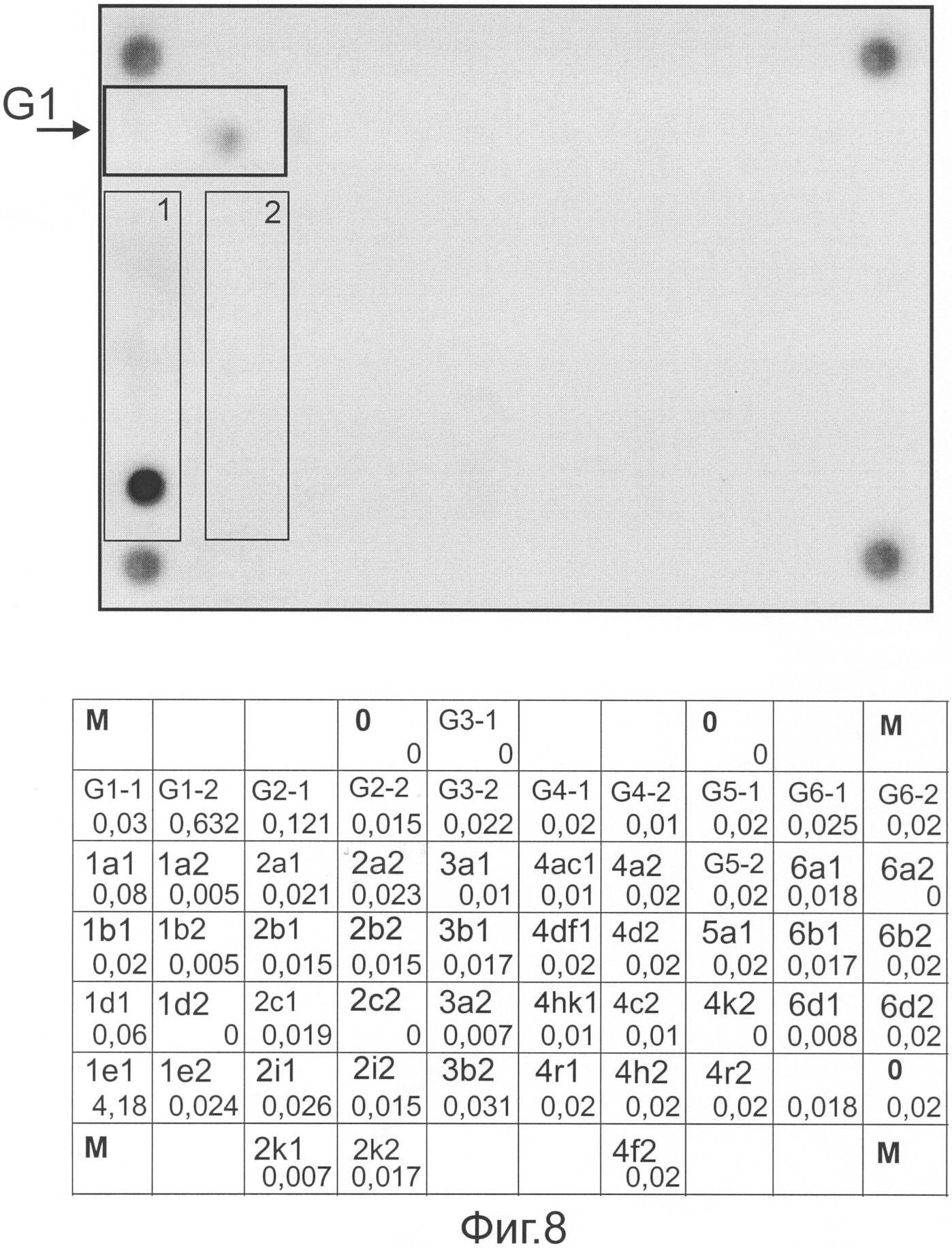 На фиг.8 представлены гибридизационная картина микрочипа и распределение нормированных гибридизационных сигналов ячеек микрочипа.