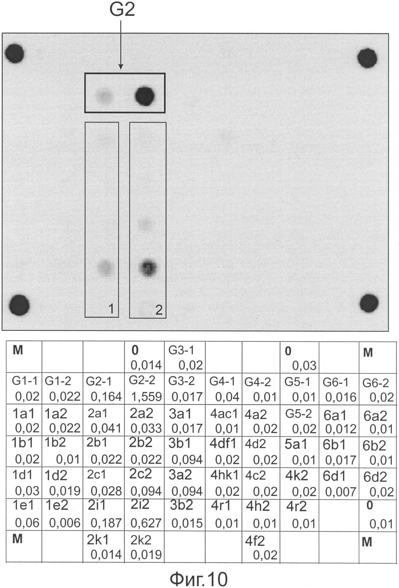 На фиг.10 представлены гибридизационная картина микрочипа и распределение нормированных гибридизационных сигналов ячеек микрочипа.