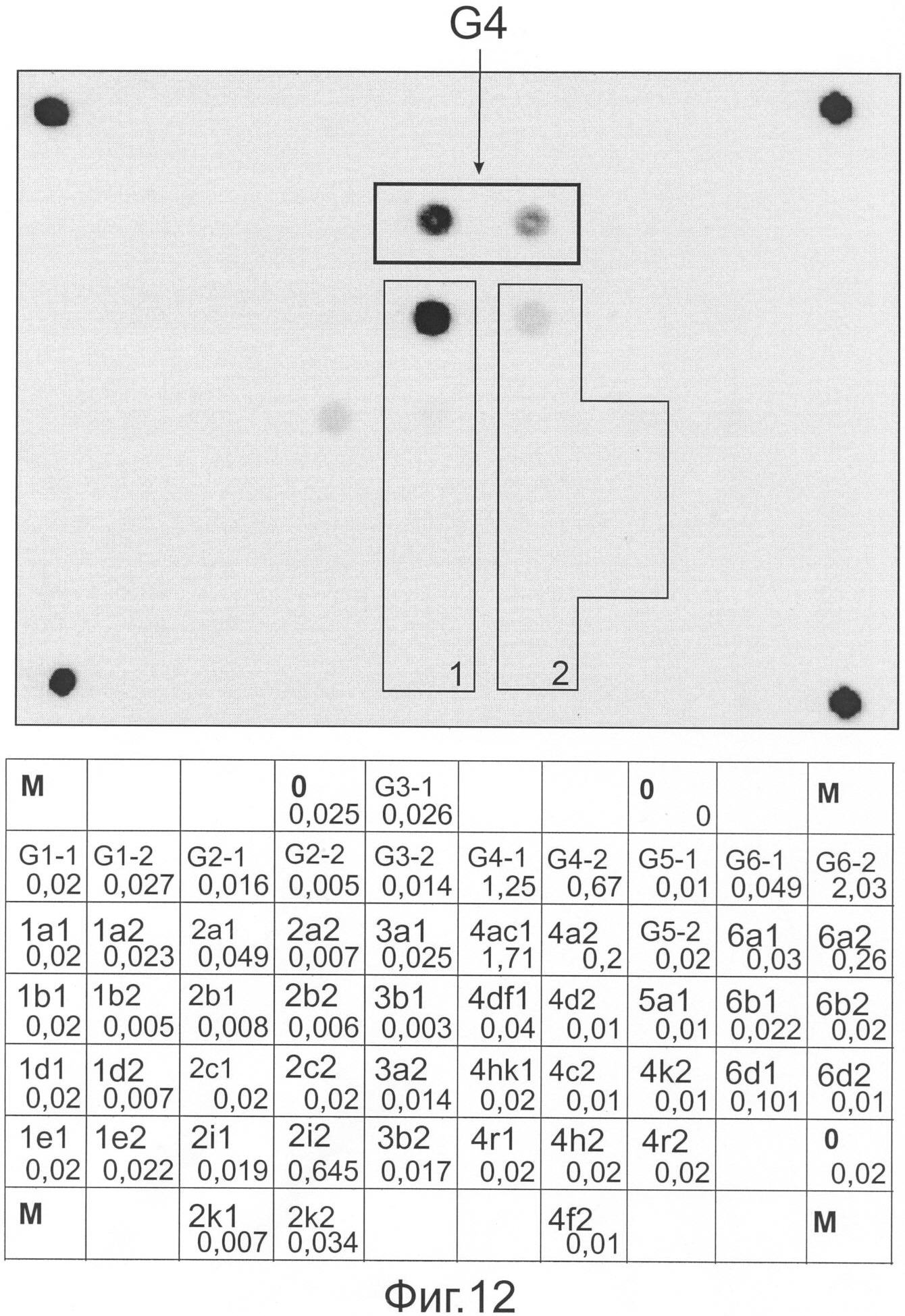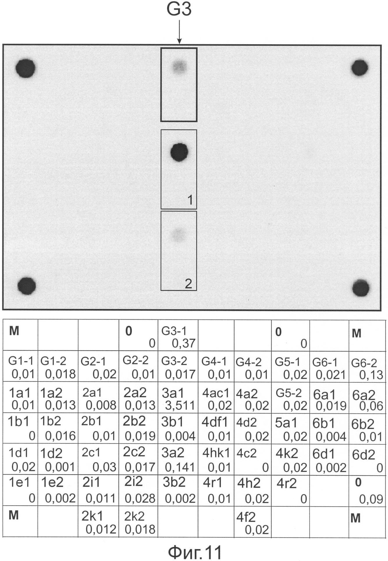 На фиг.11 представлены гибридизационная картина микрочипа и распределение нормированных гибридизационных сигналов ячеек микрочипа.